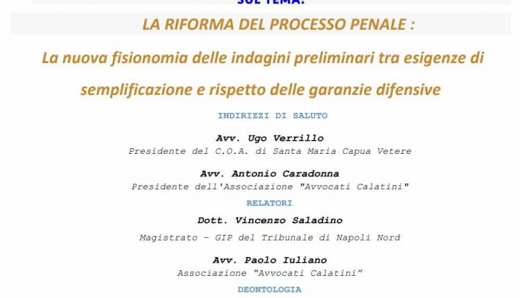 Maddaloni. Si terrà il 17 Dicembre 2021, dalle 16:00 alle 19:00, il convegno organizzato dall’Associazione Avvocati Calatini di Maddaloni (CE) e dall’Ordine degli Avvocati di Santa Maria Capua Vetere dal titolo “La Riforma del processo penale: la nuova fisionomia delle indagini preliminari tra esigenze di semplificazione e rispetto delle garanzie difensive”.