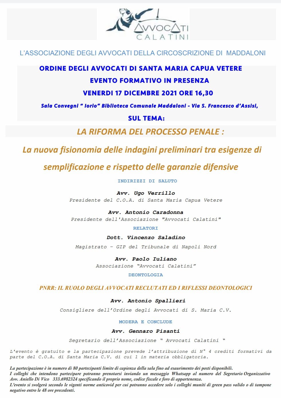 Dopo gli indirizzi di saluto dell’avvocato Ugo Verrillo (Presidente del C.O.A. di Santa Maria Capua Vetere), dell’avvocato Antonio Caradonna (Presidente dell’Associazione “Avvocati Calatini”), interverranno quali relatori l’avvocato penalista Paolo Iuliano ed il Dott. Vincenzo Saladino, Giudice per le indagini preliminari presso il Tribunale di Napoli Nord.
