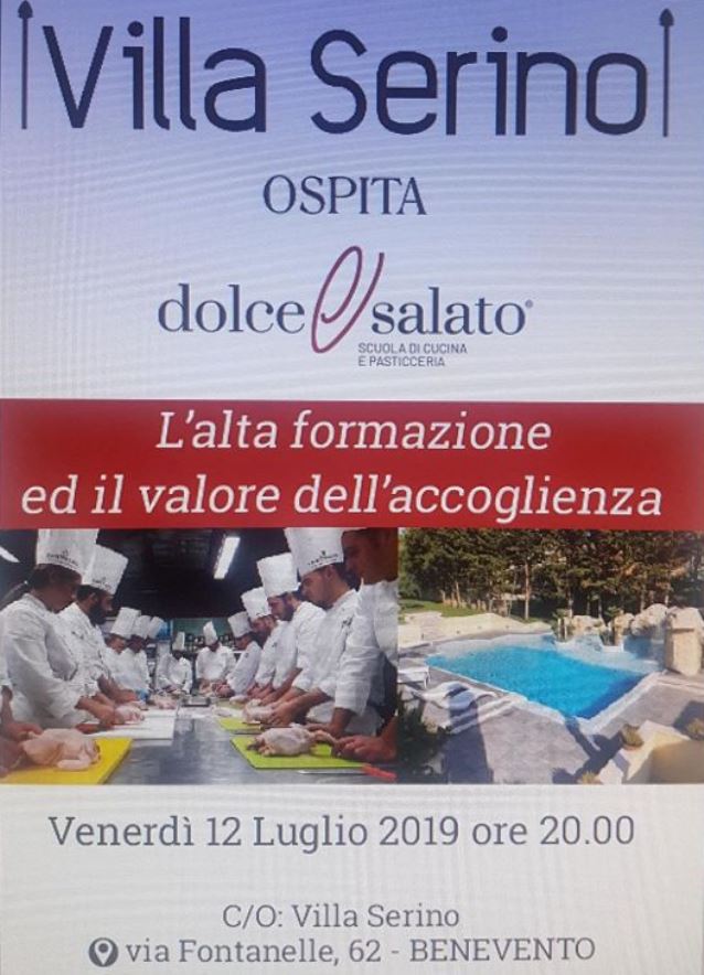 A Villa Serino (BN), il prossimo 12 luglio 2019 la scuola di cucina e pasticceria Dolce & Salato di Maddaloni (CE), proclamerà, come di consueto, la chiusura dell’anno accademico 2018/2019, percorso in cui si sono annoverate diverse sessioni formative di qualifiche professionali riconosciute in tutta Europa. Dopo tante e diverse tournée, questa volta i due fondatori, gli chef Giuseppe Daddio e Aniello di Caprio, hanno scelto il Sannio, terra ricca di valori, radici e tradizioni che si tramandano da generazioni divenuta Capitale Europea del Vino 2019, come sede per l’evento che si terrà in una cornice meravigliosa, quella di Villa Serino a Benevento.