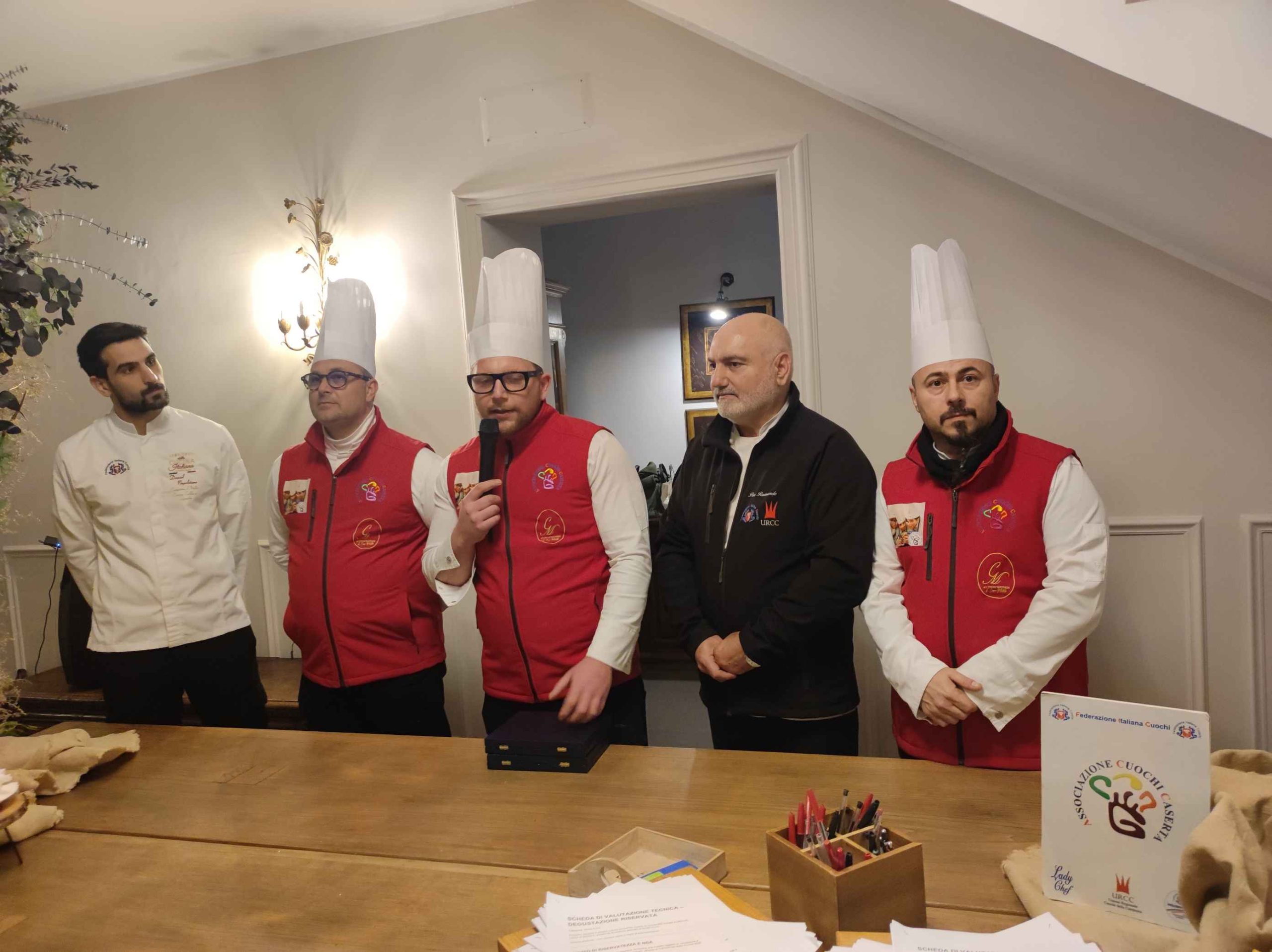 Una serata magistrale che ha avuto come padrona di casa la signora Maria Marcello. In ambienti di una eleganza sobria e rassicurante la presentazione del giovane De Lucia, ha conseguito un argento ai Campionati di Cucina Italiana 2025 in Rimini. Quest’anno 2026 il giovane chef mira alla medaglia d’oro nello stesso Campionato della Cucina Italiana.