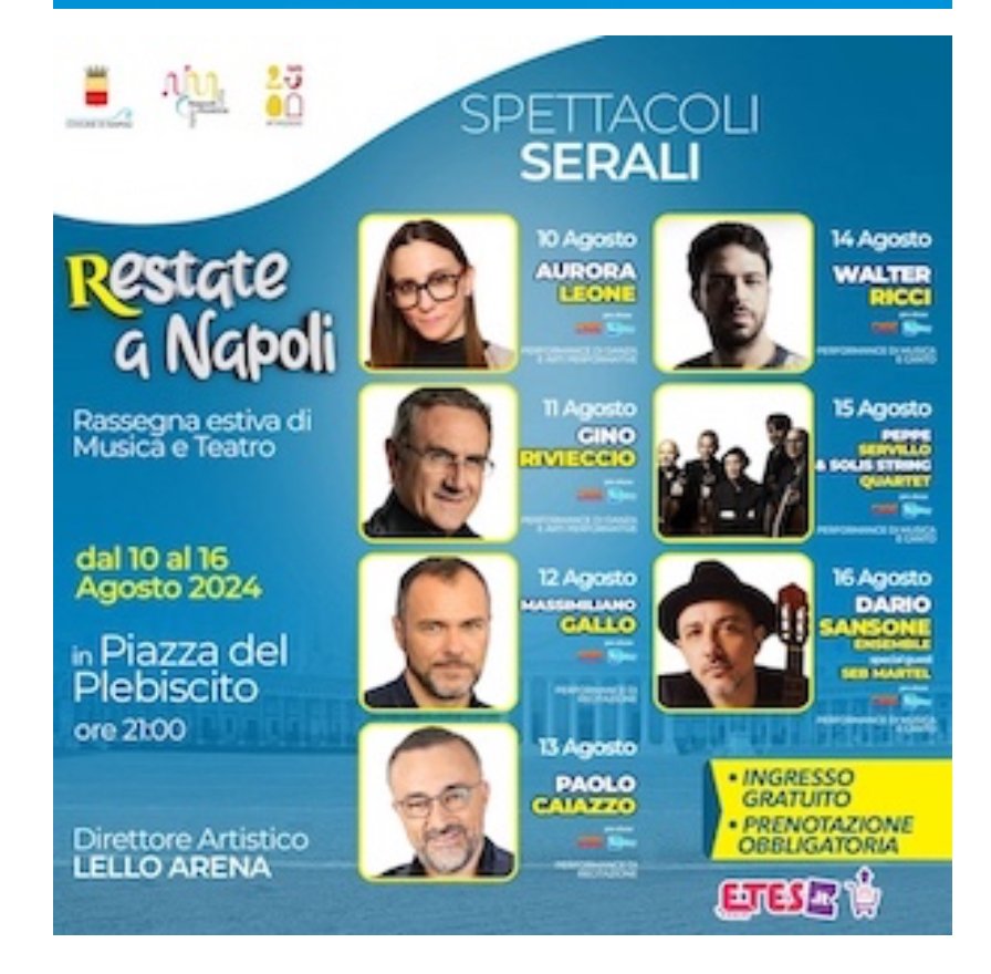 «Con Restate a Napoli, attraverso musica e spettacolo, offriamo un intrattenimento di qualità e gratuito sia ai cittadini che trascorrono l’estate in città sia ai turisti in visita” – dichiara il Delegato del Sindaco per l’industria musicale Ferdinando Tozzi. “La rassegna non solo porta sul palco grandi artisti di fama nazionale e internazionale, ma dedica ampio spazio a giovani talenti emergenti, creando occasioni concrete di crescita e visibilità. In questo modo, l’evento diventa anche un volano per l’industria culturale, generando valore sociale ed economico e contribuendo a rafforzare l’immagine di Napoli come capitale della creatività e dell’accoglienza.»