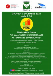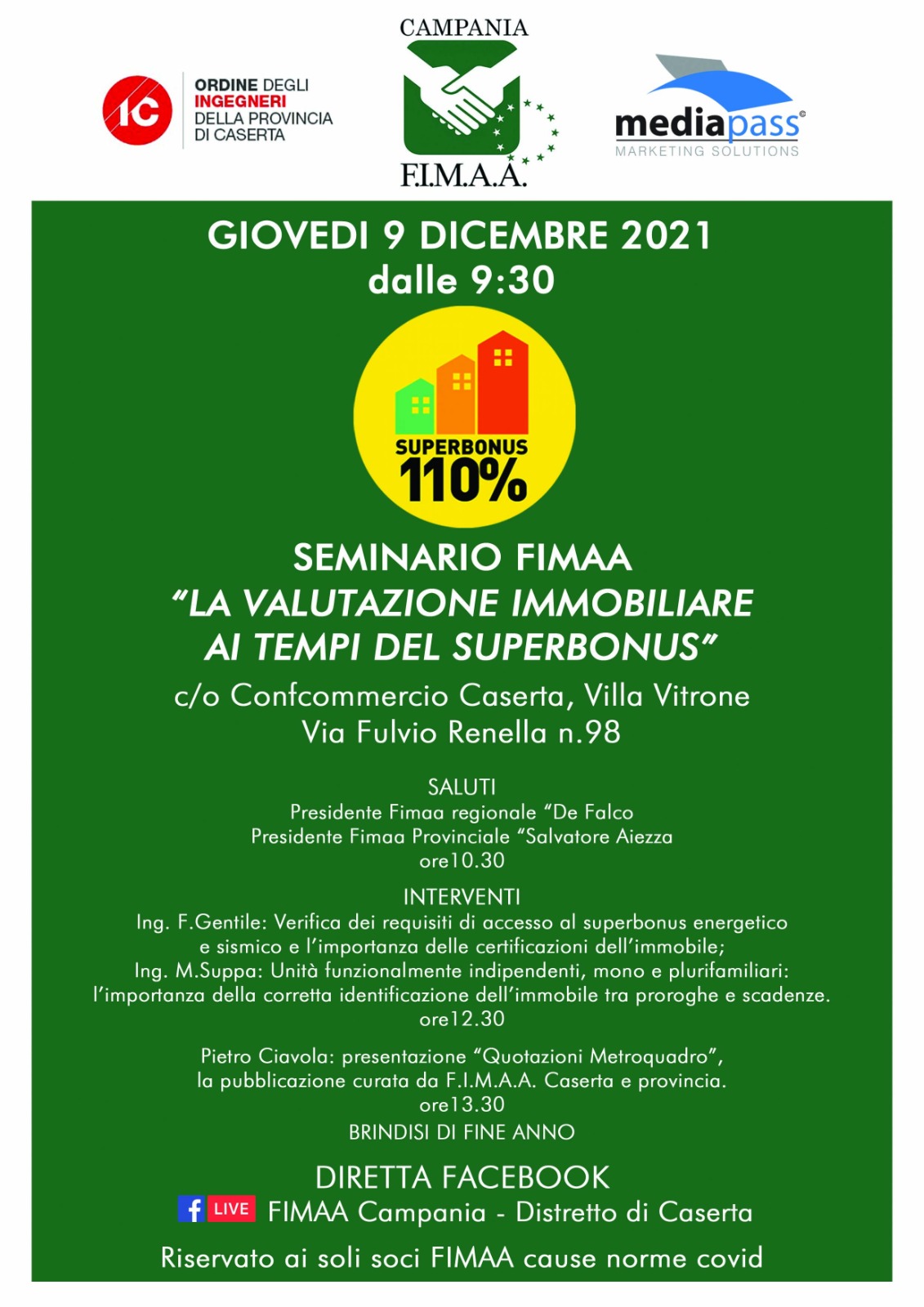 ‘La valutazione immobiliare ai tempi del superbonus 110%’, questo il tema del seminario organizzato da Confcommercio Caserta in collaborazione con la Fimaa, la Federazione italiana mediatori agenti d’affari, l’ordine degli Ingegneri della provincia di Caserta e la società Mediapass Marketing Solution editrice della rivista ‘Quotazioni Metroquadro’.
