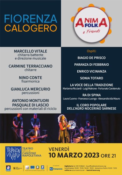 Napoli – Esplosiva come sempre l’artista Fiorenza Calogero che non smette di stupire il suo amatissimo pubblico a cui dà appuntamento al teatro Trianon Vivian di Napoli venerdì 10 marzo alle 21 con il suo bellissimo spettacolo AnimaFolk&Friends, produzione Migrazioni Sonore. Un concerto coinvolgente che abbraccia i suoni del sud Italia caratterizzandoli con un lavoro strumentale al passo coi tempi. Tammurriate, tarantelle, brani d’autore e canzoni classiche napoletane, la Calogero non lascia nulla al caso e ripropone le grandi opere del passato che naturalmente plasma con la sua particolare impronta rendendole originali e uniche. Con lei sul palco del teatro di Forcella artisti bravissimi, tutti con un’unica passione comune: la musica popolare. La Calogero, infatti, è riuscita nel corso della sua carriera artistica a divenire uno dei simboli della cultura mediterranea e popolare. Come non ricordare la sua attenzione ai riti musicali che incorniciano da secoli la devozione mariana o il suo studio e amore per il grande commediografo Raffaele Viviani. Una produzione artistica poliedrica e affascinante che oggi si manifesta nella sua completezza, appunto, nello spettacolo AnimaFolk. Compagni d’avventura della celebre artista Marcello Vitale (chitarra battente e direzione musicale), Carmine Terracciano (chitarre), Nino Conte (fisarocnica), Gianluca Mercurio (percussioni), Antonio Montuori e Pasquale Di Lascio (percussioni con materiali di riciclo). E poi tanti graditissimi ospiti al concerto della Calogero, come: Biagio De Prisco, La Voce della Tradizione composta da Marianna Ricciardi, Luigi Matrone, Fortunato Carotenuto, Il Coro Popolare dell’Agro Nocerino Sarnese, La Paranza di Febbraio (provenienti da Giugliano in Campania), Enrico Vicinanza, Sonia Totaro e i Ra Di Spina con le voci di Laura Cuomo, Francesco Luongo Alexsandra Ida Mauro e Francesco Santagata con un live electronics. <