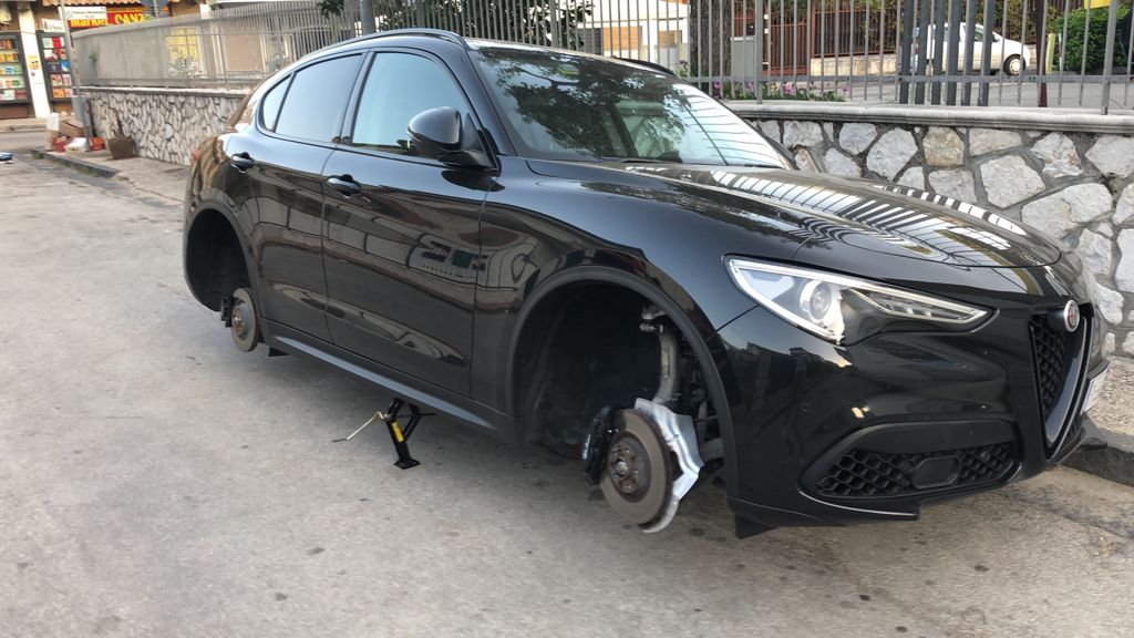 Stanotte l’auto presa di mira è un’Alfa Romeo nera, anche abbastanza nuova, lasciata miseramente su un crick.