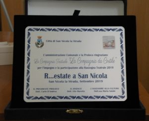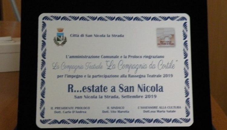 SAN NICOLA LA STRADA – L’estate è terminata già da un pò ma l’Amministrazione comunale guidata dal Sindaco Vito MAROTTA non si è dimenticata dell nove compagnie teatrale che, per tutto il mese di luglio 2019, hanno contribuito ad offrire ai cittadini sannicolesi un’estate diversa anche a coloro che, per diversi motivi, non hanno potuto andare in vacanza e sono rimasti in Città e facendoli distrarre per alcune ore con uno spettacolo teatrale di grande comicità.