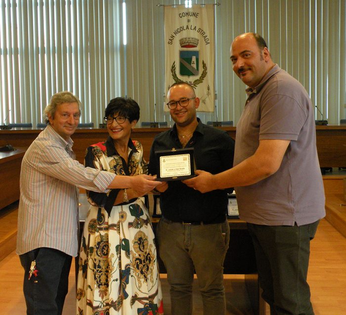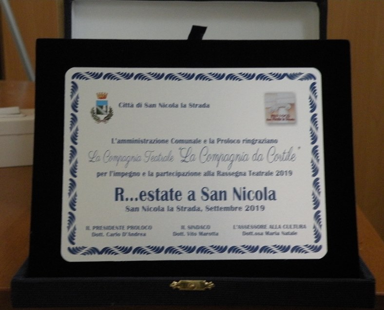 Venerdì, 20 settembre 2019, con inizio alle ore 17:30, presso la Sala consiliare, il Sindaco Vito Marotta, l’Assessore alla Cultura Maria NATALE ed il Presidente della locale Pro Loco, Carlo D’Andrea, grazie al quale è stato possibile organizzare la rassegna teatrale “R….estate a San Nicola 2019”, hanno voluto ringraziare le compagnie teatrale con una targa “….. per l’impegno e la partecipazione alla Rassegna 2019”.