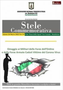 Maddaloni – Sarà inaugurata sabato 26 marzo alle ore 10,00 nella piazzetta dei passi dello sport, in via Cornato a Maddaloni la stele commemorativa che l’ANFI di Maddaloni ha fatto realizzare per ricordare le vittime del covid nelle forze armate e nelle forze dell’ordine.