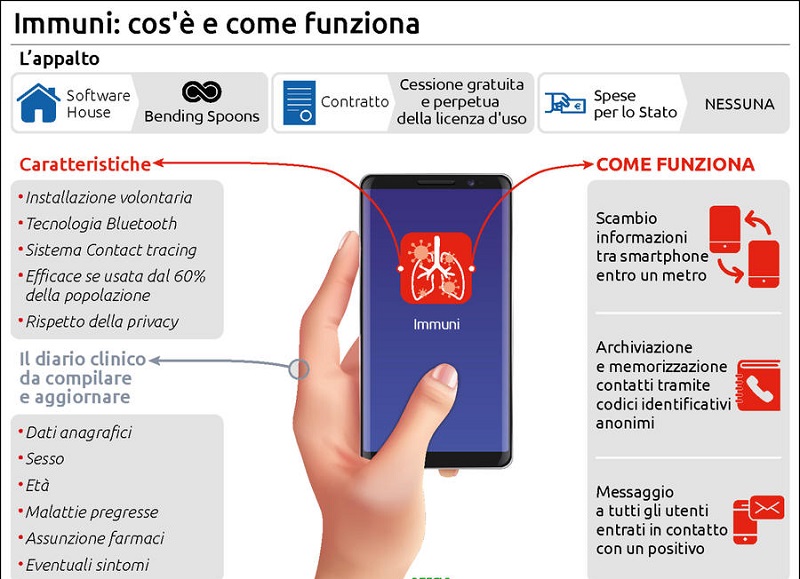 Si tratta del progetto selezionato dal gruppo di esperti insediato al dicastero dell’innovazione, proposto al premier dalla ministra Paola Pisano il 10 aprile 2020 e ora sottoposto al vaglio del team Colao. La app Immuni, che non sarà obbligatoria, ma scaricabile solo in modo volontario, si compone di due parti. La prima è un sistema di tracciamento dei contatti che sfrutta la tecnologia Bluetooth.