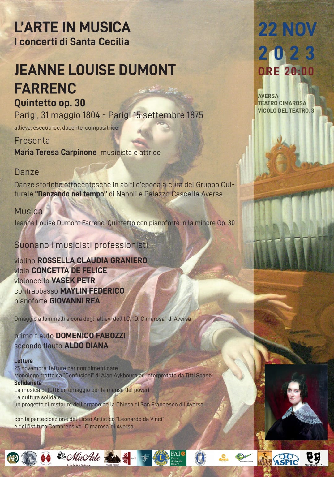 Il concerto del 22 novembre 2023, alle ore 20:00 presso il Teatro Cimarosa di Aversa, presenta il Quintetto con pianoforte in la minore Op. 30 di Jeanne Louise Dumont Farrenc, eseguito dai musicisti professionisti: