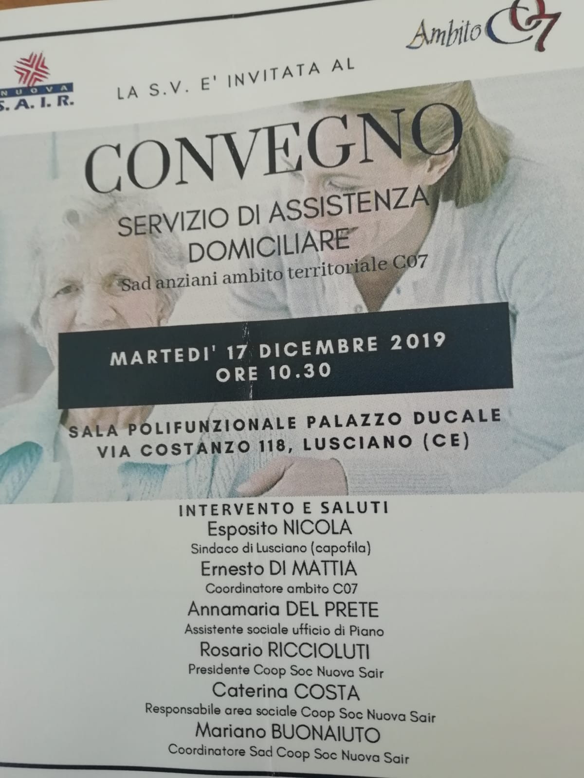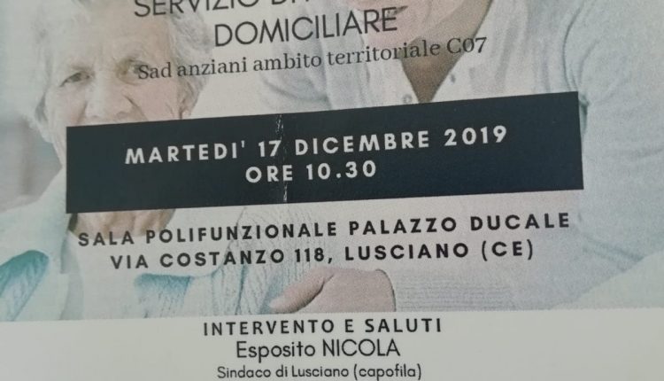 Lusciano-Martedì 17 dicembre 2019, alle ore 10:30, convegno “Servizio di assistenza domiciliare” (Sad anziani ambito territoriale C07), nella sala polifunzionale del Palazzo Ducale di Lusciano.
