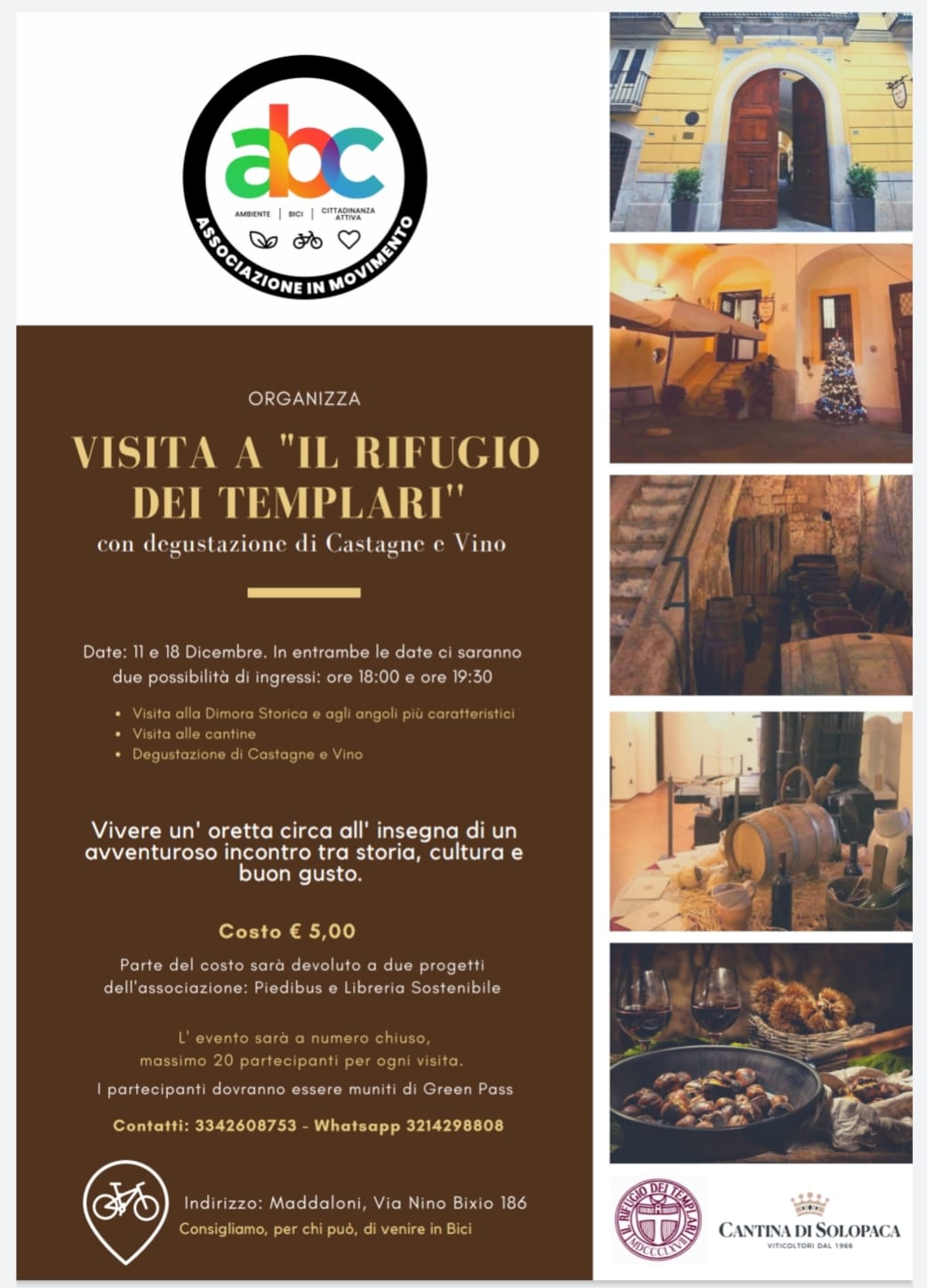 Natale è alle porte ed è tempo di immergersi nelle suggestive ed avvolgenti atmosfere natalizie. L’ Associazione in Movimento a.b.c ha in calendario varie iniziative per il periodo natalizio, puntando anche sulla valorizzazione delle bellezze del territorio maddalonese. Sabato 11 e 18 dicembre sarà aperta al pubblico la storica dimora del ” Il Rifugio dei Templari – Palazzo d’Angelo “, in via Nino Bixio affinché gli astanti possano ammirare le meraviglie custodite entro le sue mura e le sue spettacolari cantine. Un viaggio nella storia, cultura e buon gusto accompagnato da una visita guidata, nel luogo dove si riunivano i cavalieri e per godere di una degustazione di castagne e vino di Solopaca. L’ evento prevede due appuntamenti serali alle 18:00 e alle 19:30 per i giorni 11 e 18 dicembre per un totale di quattro visite. Sarà un evento a numero chiuso con max 20 partecipanti per ogni turno e con pagamento anticipato di 5,00 (Cinque/00) Euro. Qualora l’ evento venga annullato, verrà restituita la somma versata. Per ulteriori info e contatti: Messenger, Telefono : 3342608753 WhatsApp al 3314298808.