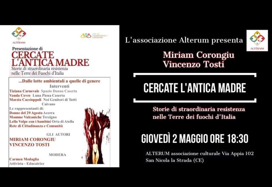 L’associazione culturale Alterum, con sede in Via Appia nr. 102 in San Nicola la Strada, già promotrice di numerosi eventi, sta organizzando la presentazione del libro “Cercate l’antica Madre” di Miriam Corungiu e Vincenzo Tosti, che si terrà giovedì, 2 maggio 2019, con inizio alle ore 18.30 presso la sede del sodalizio culturale. Alle storie di resistenza degli attivisti delle Terre dei Fuochi d’Italia si intrecceranno le testimonianze e le riflessioni sul ruolo delle Madri, delle Donne, simbolo di lotta, di resistenza e di (ri)nascita, che da anni si battono per i propri diritti per la tutela dei figli, per la salvaguardia della vita dell’ambiente e della salute.