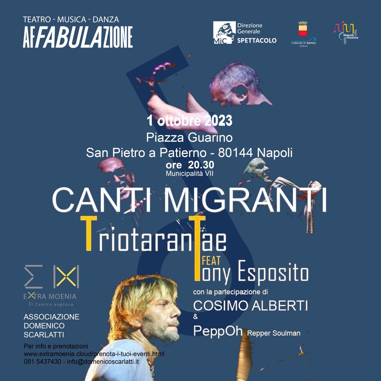 Il programma di Extra Moenia II edizione sarà inaugurato, domenica 1 ottobre 2023 alle 20,30, dal concerto Canti Migrantiin Piazza Guarino a San Pietro a Patierno con TrioTarantae, Tony Esposito e Cosimo Alberti e PeppOh Rapper Soulman.