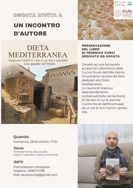 L’Associazione Oscata In-vita, il giorno 28 Dicembre 2026, alle ore 17:30, davanti ad una fornacella accesa, nel Laboratorio delle Cucine Rurali, ospita il filmaker Federico Curci, autore del libro dedicato alla Dieta Mediterranea. In presentazione un lavoro di ricerca e approfondimento contestualizzato nel territorio di Oscata, in cui le Cucine Rurali dell’Ecomuseo hanno ripreso vita. All’interno dell’elaborato il racconto del suo viaggio in Alta Irpinia e del suo percorso professionale con il quale ha analizzato le potenzialità della Dieta Mediterranea sia come strumento di educazione alimentare, sia come strumento di valorizzazione, promozione sociale e del territorio. L’autore Curci: “La mia tesi di Master in un libro, dove ho parlato della dieta mediterranea come stile di vita sano, etico ed ecosostenibile, con uno sguardo sull’Irpinia. Ho raccontato nel mio caso studio l’Ecomuseo delle Cucine Rurali di Oscata Borgo Rurale – Bisaccia, una bella realtà in cui i volontari dell’associazione Oscata inVita stanno rivalutando questo borgo con eventi e iniziative, e con la partecipazione attiva dei residenti. Ho parlato dei grani antichi con l’agricoltore resistente di Bisaccia, Giuseppe Pelullo Peppino.La prefazione sarà curata da Lucie Boissenin, architetto francese, che ha vissuto sei mesi in Irpinia per la sua tesi di dottorato. Viene spesso a trovarci in Irpinia e, l’anno scorso, ha presentato il suo libro che vi consiglio di leggere: “Irpinia 2053”, uno sguardo al futuro per ripensare il presente. La foto in copertina rappresenta l’antico forno a paglia di Oscata, ristrutturato dai volontari. L’ho scattata durante uno degli eventi associativi “Oscata inforna”. Il manufatto rappresenta l’unico forno a paglia funzionante in Irpinia. Naturalmente, nel mio libro non mancano altri riferimenti all’Irpinia e ad altre realtà importanti come l’associazione Info Irpinia”. Questo lavoro di tesi è il coronamento di un percorso accademico presso il Master in Patrimonio Culturale ed Enogastronomia, discusso a Roma con l’Università Telematica Internazionale Uninettuno nel 2025. In discussione un percorso che intreccia cultura, alimentazione, paesaggio e identità, il lavoro approfondisce il valore della dieta mediterranea come modello di vita sostenibile e patrimonio immateriale, con uno sguardo particolare all’Irpinia e alle sue eccellenze enogastronomiche”. Ad intervenire il Presidente dell’Associazione Domenico La Penna di Oscata in Vita e Giuseppe Pelullo. Un lavoro davvero ben fatto che ha ampliato il suo valore con la prefazione di Lucie Boissenin, autrice di una tesi di dottorato dedicata al territorio irpino e del volume, nato dall’esperienza di ricerca sul campo in Irpinia, “Irpinia 2053: Uno sguardo al futuro per ripensare il presente”.