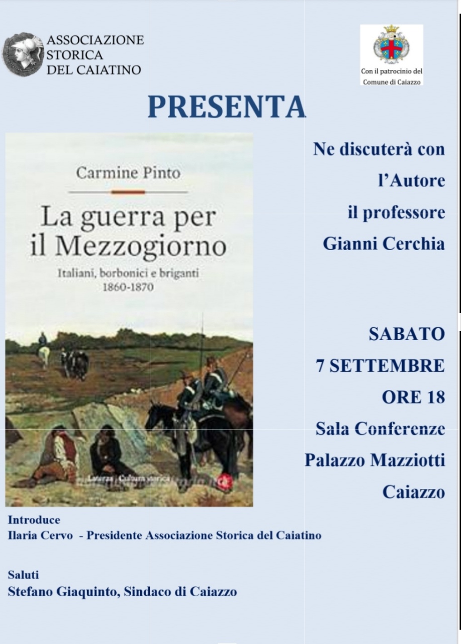 Sabato 7 settembre con inizio alle ore 18.00 nel Palazzo Mazziotti a Caiazzo vi sarà la presentazione del libro La guerra per il Mezzogiorno. Italiani, borbonici e briganti 1860-1870 scritto da Carmine Pinto ed edito da Laterza.