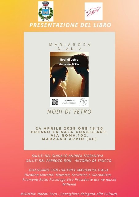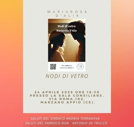 MARZANO APPIO – Giovedì 24 Aprile 2025 alle ore 18.30, nella sala consiliare del Comune di Marzano Appio, l’autrice esordiente Mariarosa D’alia presenta il libro: “Nodi al vento”. Un romanzo che tratta della parità di genere. Quei “Nodi” ancora non sciolti e che tengono legate le donne a un passato che non dovrebbe più appartenere al presente. La presentazione del libro sarà aperta dai saluti del sindaco Andrea Terranova e del parroco don Antonio De Trucco. Dialogheranno con l’autrice D’Alia la psicologa Filomena Rota, vicepresidente dell’associazione nazionale “Millemè” e la scrittrice e giornalista Nicolina Moretta. Modererà l’incontro la consigliera comunale con delega alla cultura, Noemi Fera. Il libro “Nodi al Vento” è ordinabile su: www.bookabook.it , il ricavato delle vendite andrà all’associazione “Millemè”, associazione che opera per la parità di genere.