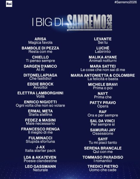 Ermal Meta con Stella stellina. “La canzone che porto a Sanremo nel 2026 si chiama “Stella stellina”. E’ una canzone che parla di resistenza, di speranza e racconta di una bambina. Quello che mi ha fatto pensare che questa fosse la canzone giusta è l’emozione forte che ho provato quando l’ho scritta”. Ermal Meta il 27 febbraio pubblicherà l’album “Funzioni vitali”.