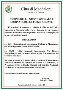 Il Comune di Maddaloni celebra la storica data del 4 Novembre . Infatti è ufficiale il manifesto, a nome del Sindaco Andrea De Filippo , del calendario delle celebrazioni in onore delle caduti e dei membri delle Forze Armate e della Giornata di Unità Nazionale. Le celebrazioni vedranno la deposizione ,alle ore 09.30, della corona di alloro presso il Monumento del Milite Ignoto in Piazza della Vittoria con le autorità civili e militari , la Protezione Civile , la Polizia Municipale , le scuole locali e la banda musicale del Convitto Nazionale Giordano Bruno. E con i rappresentanti dell’ Associazione Nazionale Mutilati ed invalidi di Guerra. Mentre poi alle ore 11.30 sarà la volta della deposizione della corona presso il Monumento ai Caduti di Nassirya in via Libertà.