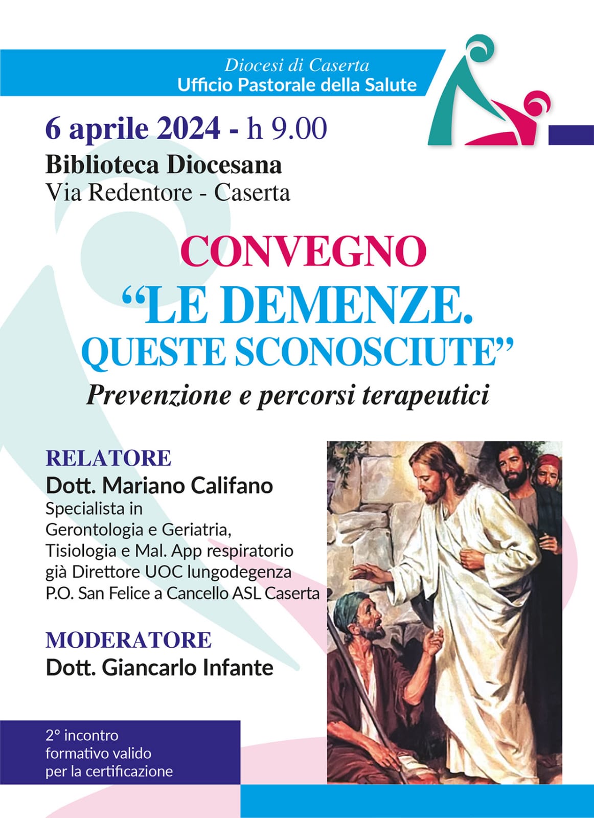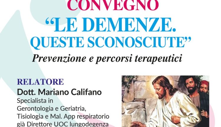 Sabato 6 aprile 2024, con inizio alle ore 9.00 presso la Biblioteca Diocesana di Caserta in via Redentore, avrà luogo il convegno “LE DEMENZE – QUESTE SCONOSCIUTE” Prevenzione e percorsi terapeutici, organizzato dall’Ufficio Diocesano per la Pastorale della Salute di cui è direttore don Antonello Giannotti. All’evento moderato dal dott. Giancarlo Infante, interverrà come relatore il dott. Mariano Califano, specialista in Gerontologia e Geriatria, Tisiologia e Malattie Apparato respiratorio, già Direttore UOC lungodegenza P.O. san Felice a Cancello ASL Caserta.