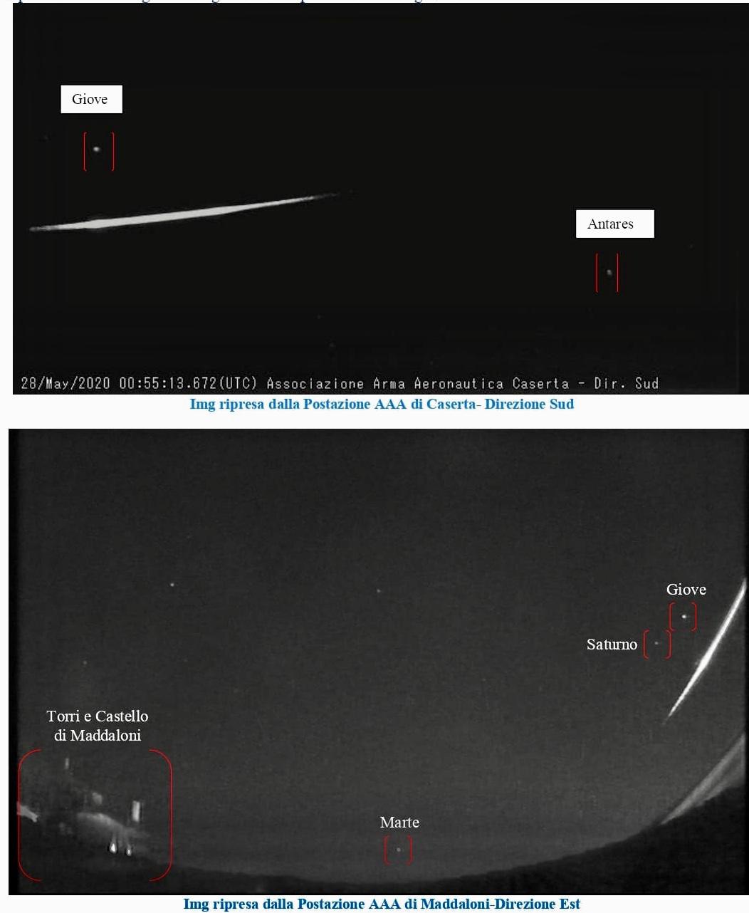 Nella notte del 28 Maggio u.s., alle ore 00:55:12 UTC (02:55:12 Locali) , le Telecamere astronomiche della Sezione di Caserta dell’Associazione Arma Aeronautica, installate -presso la Specola Tifatina, a Tuoro e a Maddaloni e puntate, rispettivamente in direzione Sud e in direzione Est hanno rilevato il notevole bolide riportato nelle immagini sottostanti.