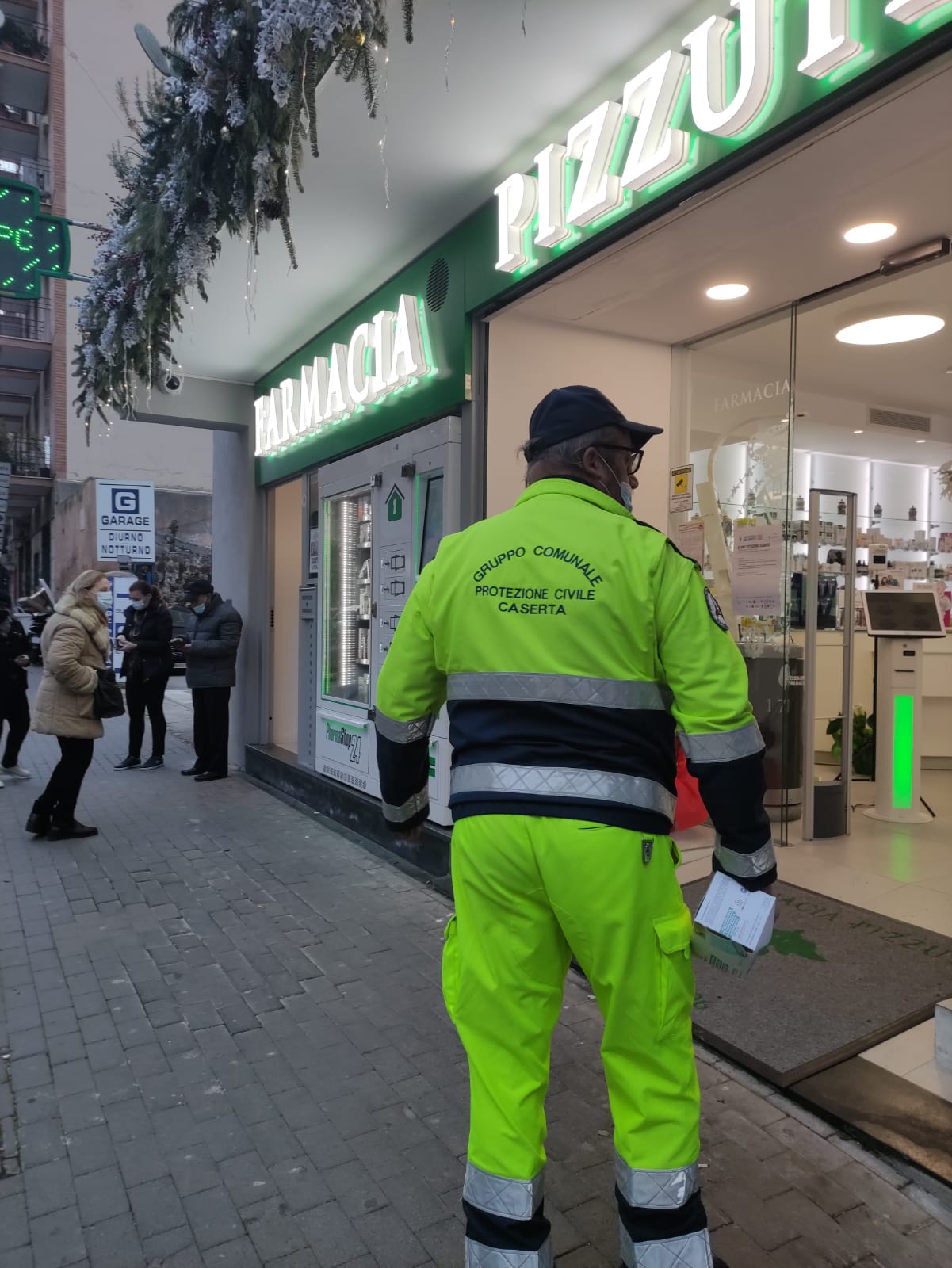 In particolare il servizio è stato eseguito all’esterno delle seguenti farmacie: Farmacia Brignola in via Ruggiero; Farmacia Pizzuti in via Ricciardi; Farmacia Sant’Anna in piazza Sant’Anna; Farmacia Gadola Odierna in via Acquaviva. Il giro di perlustrazione ha poi coinvolto anche la Farmacia Fugaro in via Pier Paolo Pasolini, la Farmacia Ferreri in via Caduti sul Lavoro e la Farmacia Iodice in via Marconi. Per l’occasione i volontari della Protezione Civile hanno altresì distribuito le mascherine anti-Covid fornite dal Comune di Caserta.