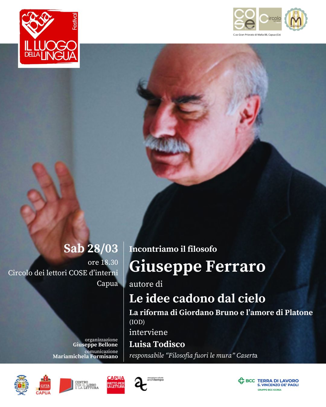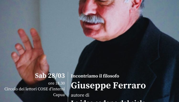 Sabato 28 marzo 2026 alle ore 18.30 al Circolo dei lettori di Capua e Mater bistrot – Cose d’Interni Libri per gli eventi targati Capua il Luogo della Lingua festival. Dialogo con il filosofo Giuseppe Ferraro, autore del libro: *Le idee cadono dal cielo. La riforma di Giordano Bruno e l’amore di Platone*, edito da IOD. Ad accompagnare il filosofo la responsabile dell’associazione “Filosofia fuori le mura” della provincia di Caserta Luisa Todisco. Parleremo di eresia, di fuga, del fuori luogo. In un tempo “a senso unico” che dirige, detta legge, decide, lasciando l’umanità travolta, ferita, fagocitata dalla guerra, dal disinteresse, cercheremo di andare controcorrente, perseguiremo l’inattualità, il richiamo del diverso, del disordine che soffoca sotto l’ordine costituito. Dialogheremo con Giordano Bruno e con Platone della pace. Del Bene. Del desiderio. Dei legami. Di quanto sia necessario l’ inattuale per riconoscersi liberi.