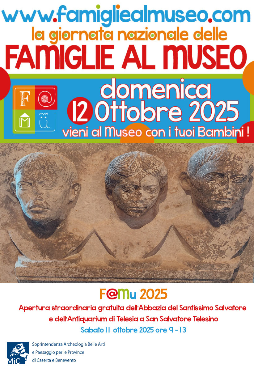 Sabato 11 ottobre 2025 la Soprintendenza Archeologia belle arti e paesaggio per le province di Caserta e Benevento aderisce alla Giornata Nazionale delle Famiglie al Museo, patrocinata dal Ministero della Cultura e da ICOM Italia e organizzata dall’Associazione Famiglie al Museo, con l’apertura straordinaria gratuita dell’Abbazia del Santissimo Salvatore e l’Antiquarium di Telesia a San Salvatore Telesino dalle 9 alle 13.