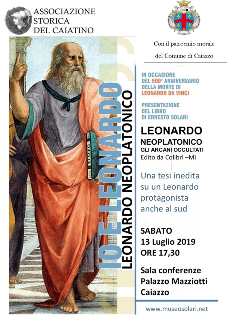 Quest’anno ricorrono 500 dalla morte di Leonardo da Vinci. L’Associazione Storica del Caiatino, presieduta dalla d.ssa Ilaria Cervo, ricorda l’avvenimento con la presentazione del libro Leonardo Neoplatonico. Gli arcani occultati di Ernesto Solari, edito da Colibrì Edizioni. L’appuntamento è per sabato 13 luglio alle ore 17.30 a Caiazzo nella storica cornice di Palazzo Mazziotti. Porterà i saluti dell’Amministrazione Comunale caiatina il sindaco geom. Stefano Giaquinto, a cui seguirà l’introduzione della presidente dell’ASC.