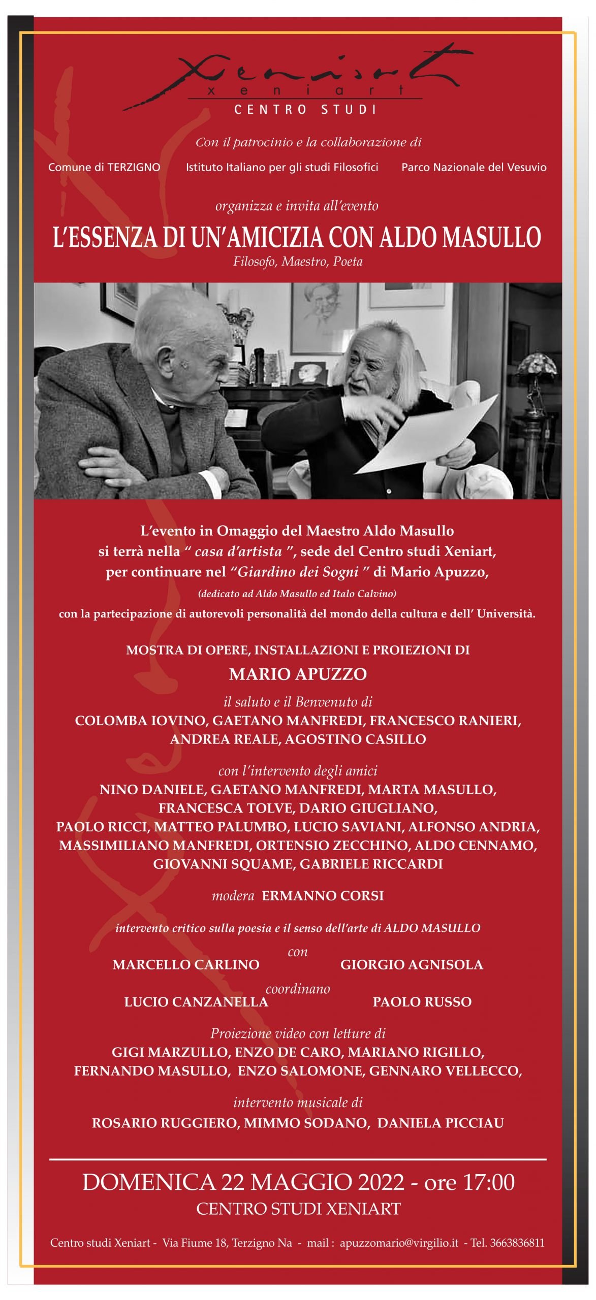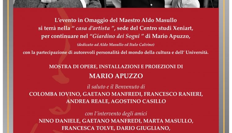 L’incontro avrà luogo domenica 22 maggio a partire dalle ore 17,00 nel “Giardino Dei Sogni” a Terzigno; giardino che lo stesso Mario Apuzzo, che ne è l’ideatore e curatore, ha voluto dedicare proprio alla memoria di Aldo Masullo ed Italo Calvino.