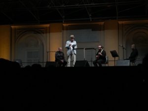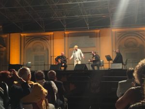 Dopo i saluti dell’Assessore Casale e l’introduzione della presentatrice, salgono sul palco i tre musicisti (il cantante M. Gianluigi Esposito,il chitarrista M. Antonio Saturno e il flautista M. Aniello Rossi) che accompagneranno il maestro per tutto lo spettacolo e iniziano a suonare Napule ca se ne va.
