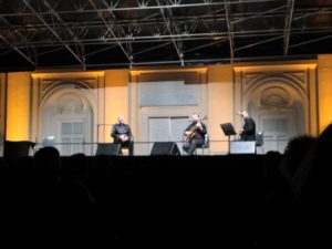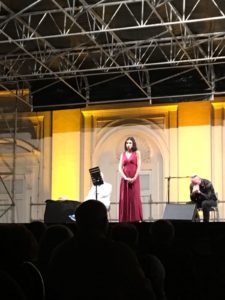 La prima poesia declamata nella magica cornice del Belvedere è Pianefforte ‘e notte del poeta Salvatore Di Giacomo. Mentre il maestro recita la poesia del poeta napoletano con le signore anziane ,sedute dietro di me, che la ripetono emozionate, ingenuamente penso che questo spettacolo di poesia sarà un po’ come un concerto: con i fans che cantano insieme al cantante di turno i suoi evergreen e che gridano felici quando l’artista annuncia il suo pezzo successivo. Infatti quando i musicisti attaccano Era de maggio le signore sono così felici e emozionate che per un momento mi aspetto che lancino sul palco qualche capo di biancheria intima con i loro numeri di telefono all’interno uso groupie nei migliori concerti rock. Poi è il momento di una poesia di Neruda e qui l’atmosfera cambia: non è solo un silenzio emozionato o rapito dalle parole del poeta che Placido recita sul palco ma è anche commosso. Un silenzio commosso in ricordo di Troisi, infatti la poesia recitata era la sua preferita di Neruda nonché quella che ispirò il suo ultimo film, Il Postino e che ,Placido racconta, una sera d’inverno Massimo lesse al maestro.