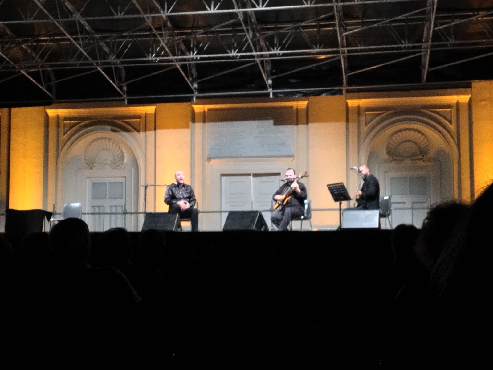 Michele Placido arriva alla fine della canzone e dopo aver salutato il pubblico e i musicisti, si siede iniziando quel lungo dialogo con il pubblico e i musicisti che durerà per tutto lo spettacolo tra canzoni e poesie. Il maestro non inizia con una poesia o parlando della canzone che hanno appena finito di suonare ma sedutosi racconta agli spettatori di come è nato lo spettacolo e di come lui e i musicisti ,che l’accompagneranno per tutta la sera, si sono conosciuti ad Angri una sera di cinque anni fa ricordando commosso le braciole di cotica preparate dalla madre del cantante (Gianluigi Esposito n.d.r.).