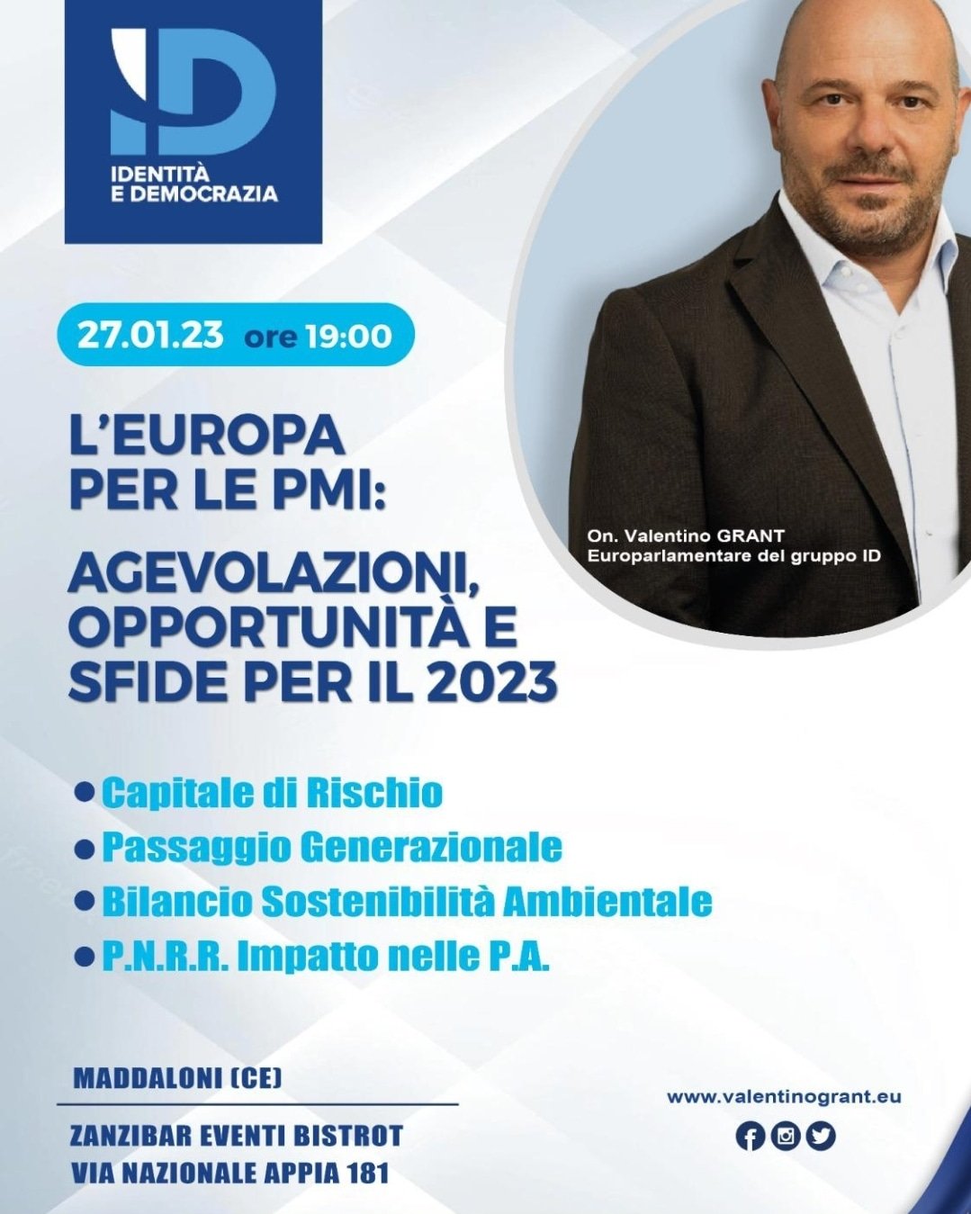 Più Europa per la Valle di Suessola è ‘ lo scopo che si prefigge questo interessante convegno che si terrà il giorno 27 Gennaio alle ore 19 presso lo Zanzibar di Maddaloni, via Nazionale Appia 181. Promotore dell’ evento la dott.ssa Antonella Lettieri. La venuta dell’ europarlamentare Valentino Grant ,membro della Commissione Europa ECON,ha lo scopo di illustrare le opportunità che il parlamento europeo propone alle aziende e alle amministrazioni locali. Un’ occasione importante per rendere l’ Europa più vicina e potenziare le risorse del territorio. Il convegno e’ aperto a tutti coloro che intendano essere più consapevoli dell’ offerta europea per l’Italia. Lettieri afferma:” C’è poca consapevolezza e conoscenza in merito ai bandi europeI e alle nuove proposte finanziarie, troppe risorse non vengono sfruttate per mancanza di conoscenza. La venuta dell’Europarlamentare Valentino Grant nel nostro territorio è un segnale importante, di ascolto ed impegno verso i nostri imprenditori, verso le nostre amministrazioni comunali. Invito tutti a presenziare all’evento che volutamente abbiamo reso pubblico con entrata libera in maniera da creare un bel tavolo di discussione che possa portare benefici per la nostra Valle di Suessola.”
