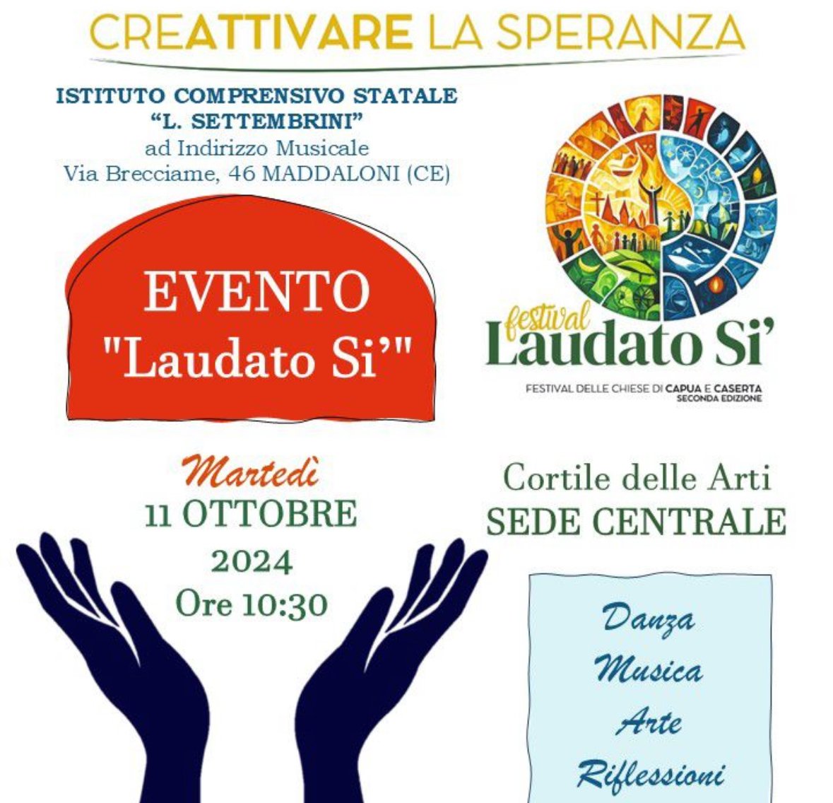 Biblioteca diocesana e l’Università Vanvitelli di Caserta, la Nostra Scuola, come le altre delterritorio, è stata invitata a creare un proprio evento “Laudato si” da tenersi in sede. Pertanto, il giorno 11 ottobre 2024, alle ore 10, 30, nel Cortile delle Arti, sede centrale Via