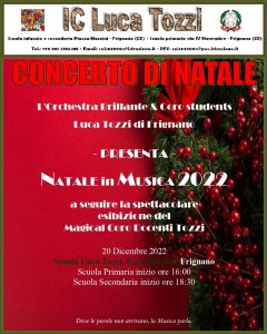 Il 20 dicembre l’Istituto Comprensivo “Luca Tozzi” di Frignano presenta il suo concerto di Natale, Concerto che coinvolge tutta la scuola. Alle 16,00 nel plesso di piazza Mazzini va in scena il coro della primaria, diretto dal maestro Armellino Pellegrino; alle 18 invece l’orchestra della scuola secondaria presenta il suo repertorio. Conclude la manifestazione il coro dei docenti, alla sua seconda esibizione. Le attività musicali sono il filo conduttore della vita di questa scuola e il coro dei docenti -ha dichiarato la Dirigente Gabriella Clemente-è un modo coinvolgente e divertente di fare squadra e di crescere insieme