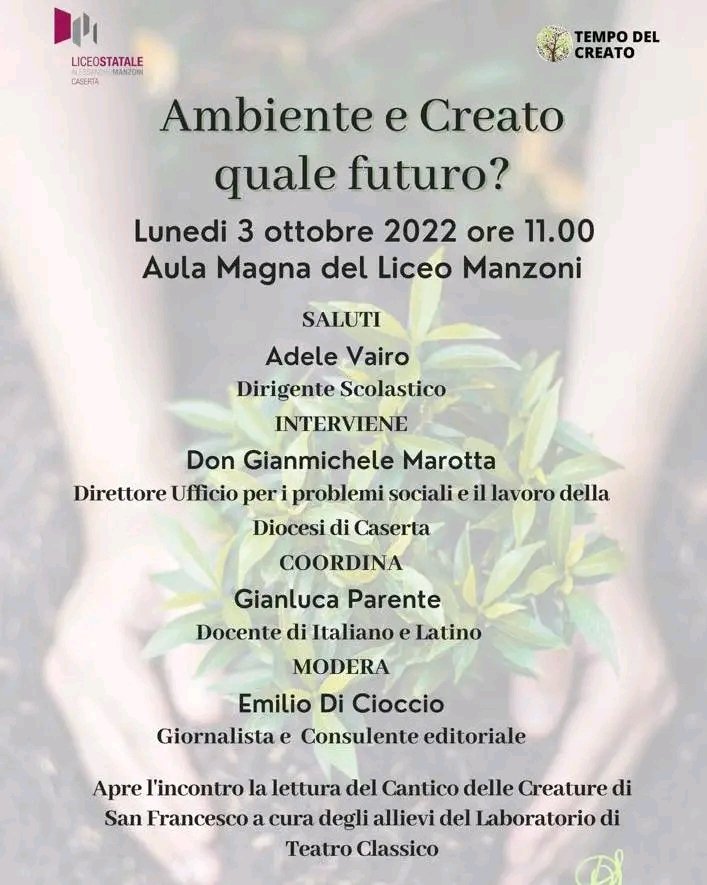 Caserta. Sarà una nuova occasione di confronto e arricchimento per gli studenti del Liceo Manzoni l’incontro dal titolo “Ambiente e Creato: quale futuro?” con Don Gianmichele Marotta, direttore ufficio per i problemi sociali e il lavoro della Diocesi di Caserta. In programma per lunedì 3 ottobre alle ore 11.00, Aula Magna, il meeting si rivelerà un momento di riflessione e sensibilizzazione su numerosi temi, ispirati alla visione cristiana del Creato, per avere cura della nostra Casa Comune secondo gli obiettivi dello sviluppo sostenibile stabiliti dall’Agenda 2030.