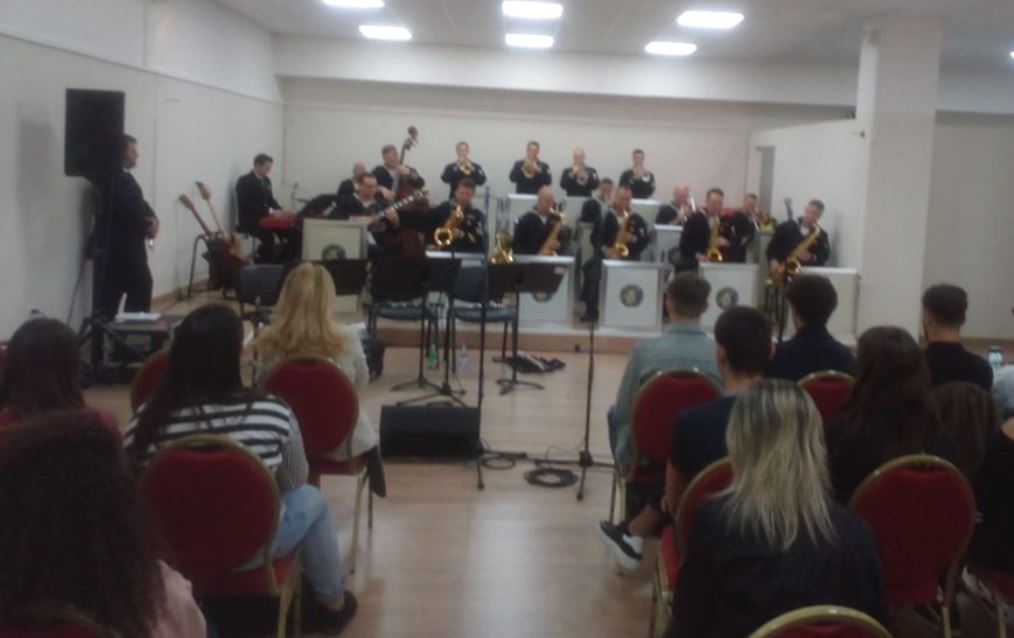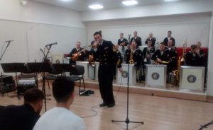 La Fleet Jazz Ensem ble Big Band, per l’occasione composta da 21 elementi ha proposto agli allievi del triennio del liceo musicale, brani dal suo vasto repertorio con diversi generi musicali, che hanno letteralmente coinvolto i giovani allievi nonché i loro docenti. L’eccezionale esibizione ha visto la band iniziare con un coinvolgente In the mood, un boogie voogie che ha fatto tornare indietro nel tempo diversi docenti, poi il concerto è proseguito con la performance del solista Robert Taylor che ha deliziato gli astanti con Buona sera signorina di Fred Buscaglione e Can’t Buy Me Love portata al successo dai Beatles, poi si è esibita come solista Cristiana Rojas, da poco in Italia con la big band, che ha proposto Napulè dell’indimenticato Pino Daniele e la celeberrima O Sole Mio eseguite in napoletano in maniera eccezionale, concludendo con New York New York, coinvolgendo i discenti che l’hanno accompagnata con un ritmico battito di mani.