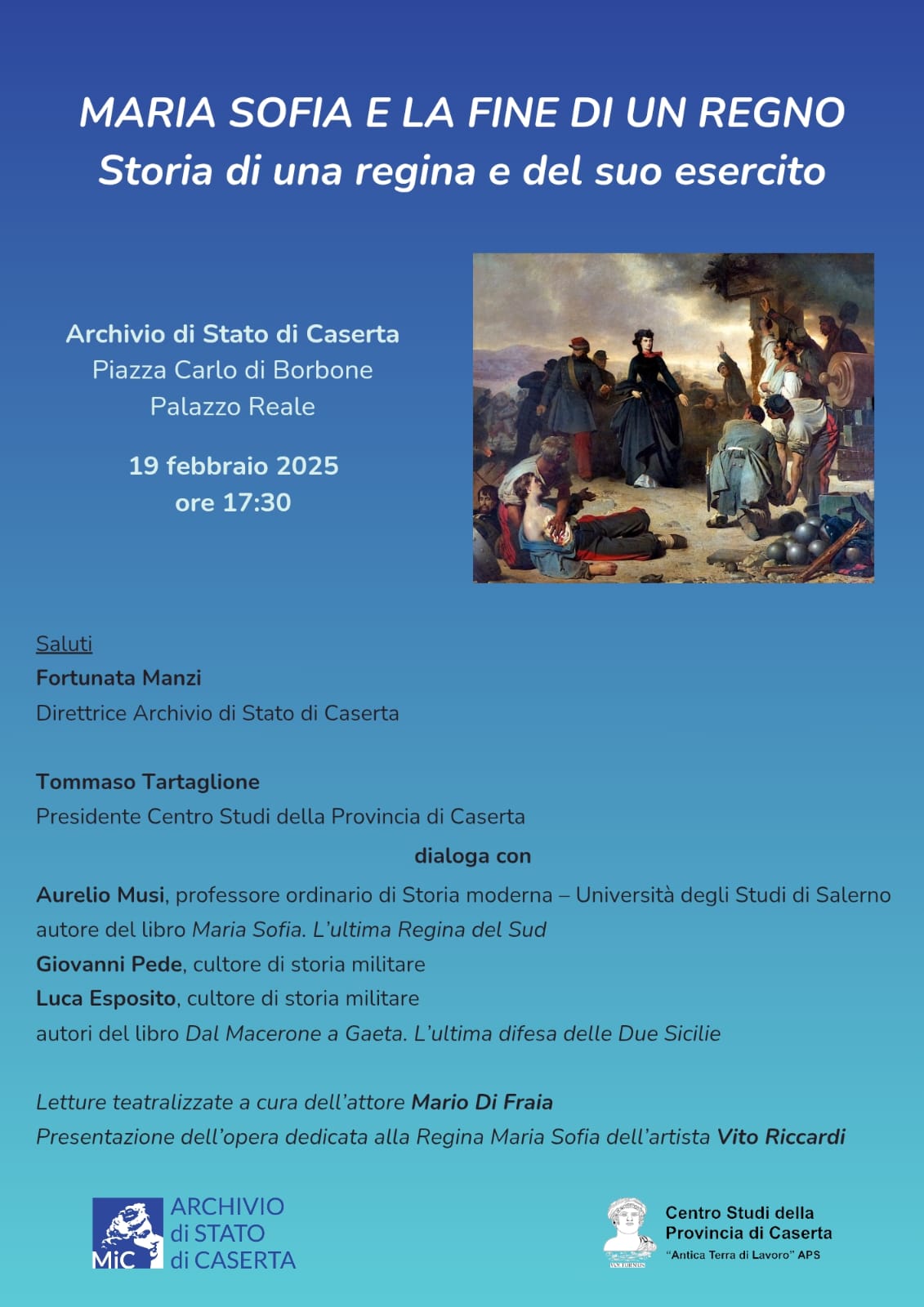 L’ultima regina del SUD, Maria Sofia di Baviera, moglie di Francesco II di Borbone ultimo Re dei Borbone di Napoli, al centro della trattazione sull’ex Regno delle Due Sicilie, sabato 19 febbraio 2025 alle 17,30 presso l’archivio di stato di Caserta. ll Centro Studi della Provincia di Caserta organizza insieme all’ Archivio di Stato di Caserta un pomeriggio dedicato all’ultima regina del Sud, in occasione del centenario della morte, all’Esercito delle Due Sicilie e alle battaglie che portarono all’unificazione e alla invasione piemontese. Tommaso Tartaglione, presidente del centro studi della provincia di Caserta, dialogherà con Aurelio Musi, professore di storia moderna dell’università degli studi di Salerno, autore del libro “Maria Sofia. L’ultima regina del SUD” Presenti anche Giovanni Pede e Luca Esposito, cultori di storia militare, autori del libro, “Dal Macerone a Gaeta, L’ultima difesa delle Due Sicilie”. Verranno recitati alcuni brani dall’attore Mario Di Fraia. Sarà anche presentata l’opera dedicata alla Regina da Vito Riccardi.