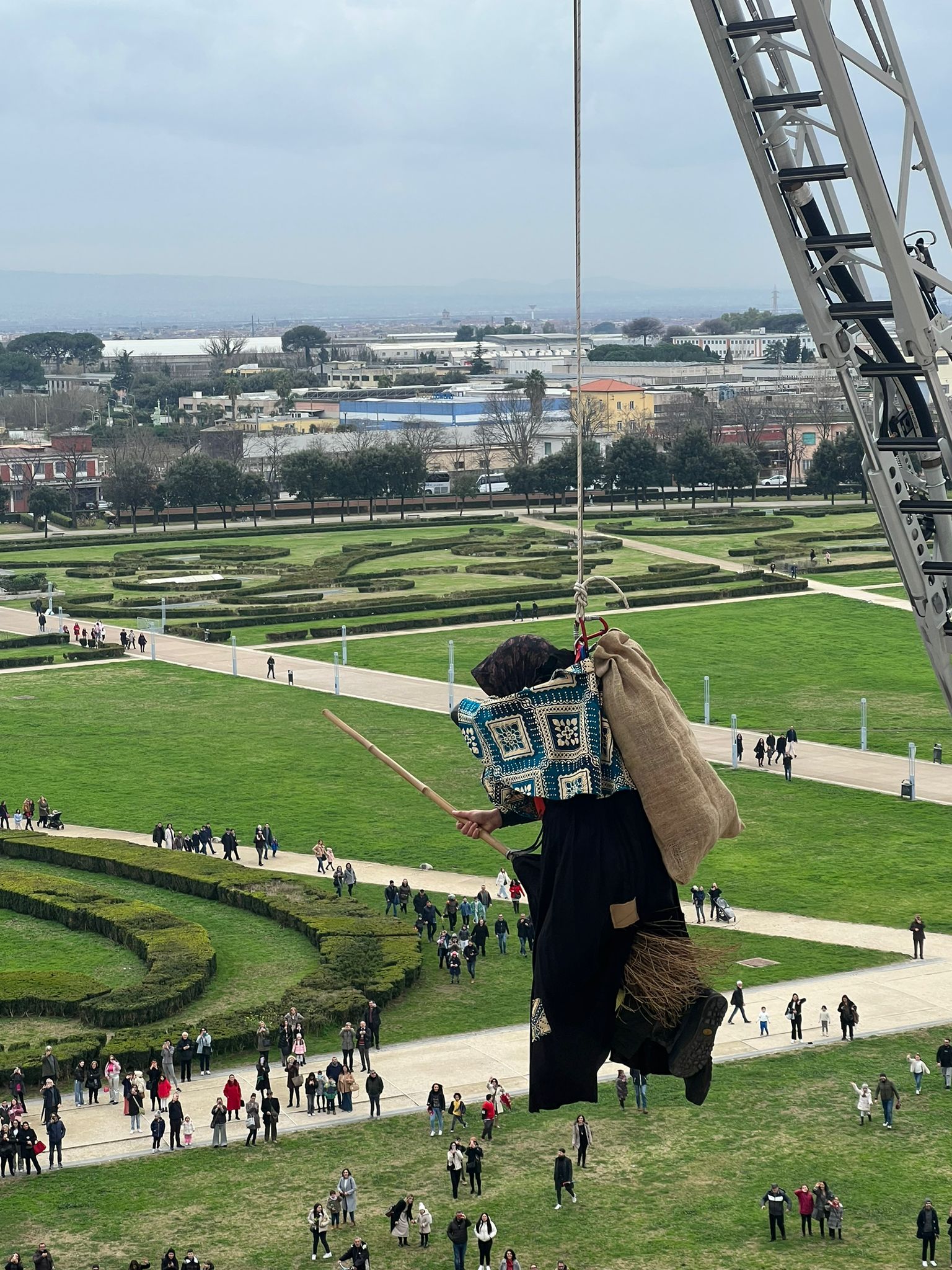 L’evento, organizzato dal Comune di Caserta, in collaborazione con il Comando Provinciale dei Vigili del Fuoco e la Reggia di Caserta, vedrà un vigile del fuoco, nei panni di una simpatica e coraggiosa Befana, calarsi da una finestra della facciata della Reggia con l’ausilio di automezzi speciali dei vigili del fuoco per interventi su edifici a grandi altezze. La Befana scenderà dal Palazzo Reale e atterrerà in piazza per distribuire doni e dolcezze ai bambini.