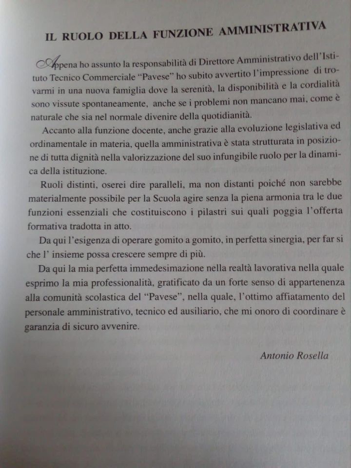 Caserta.All’età di 66 anni si è spenta la cara esistenza di Antonio Rosella, Direttore Amministrativo dell’ITC “Cesare Pavese” prima e poi  dell’Istituto “Terra di Lavoro” dove è andato in quiescenza nel giugno del 2014 e ricordo ancora  le toccanti parole della preside Emilia Nocerino nel sottolineare il suo operato. Antonio Rosella  con l’ITC “Pavese” nell’a. s. 2008-2009 aveva festeggiato il trentesimo anniversario dell’Istituto (1978/79 – 2008/2009) e  nella pubblicazione redatta per la ricorrenza, Antonio Rosella nelle sue considerazioni, sottolineava come accanto alla funzione docente, anche grazie alla evoluzione legislativa ed ordinamentale in materia, quella amministrativa sia  stata  strutturata in posizione di tutta dignità nella valorizzazione del suo infungibile ruolo per la dinamica della istituzione. Ruoli distinti, oserei dire paralleli – diceva Antonio – ma non distanti poiché non sarebbe materialmente possibile per la Scuola agire senza la piena armonia tra le due funzioni essenziali che costituiscono i pilastri sui quali poggia l’offerta formativa tradotta in atto.