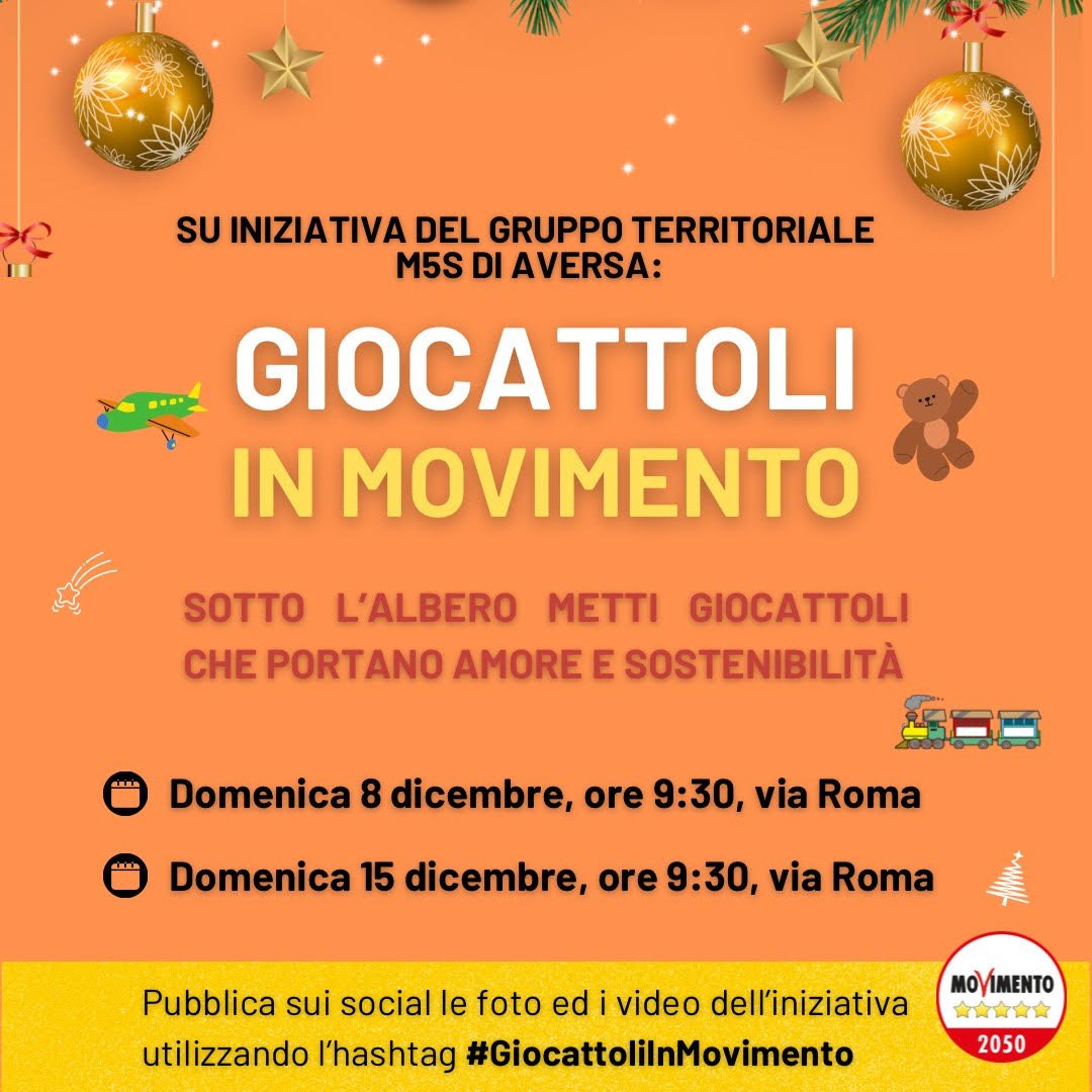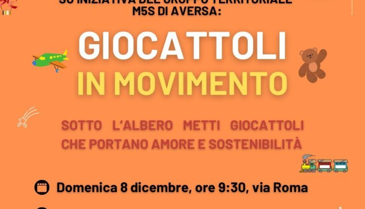 Il MoVimento 5 Stelle di Aversa torna in piazza con l’iniziativa “Giocattoli in MoVimento”, evento storico che da anni si tiene sui territori e che i pentastellati normanni hanno già portato in città. Gli appuntamenti si terranno l’8 e il 15 dicembre in via Roma, all’angolo con piazza Municipio, dalle 9:30 alle 13:00, in cui attivisti e cittadini potranno portare giocattoli che verrano poi donati a chi vive situazioni di difficoltà, in linea con lo spirito solidale del Natale.
