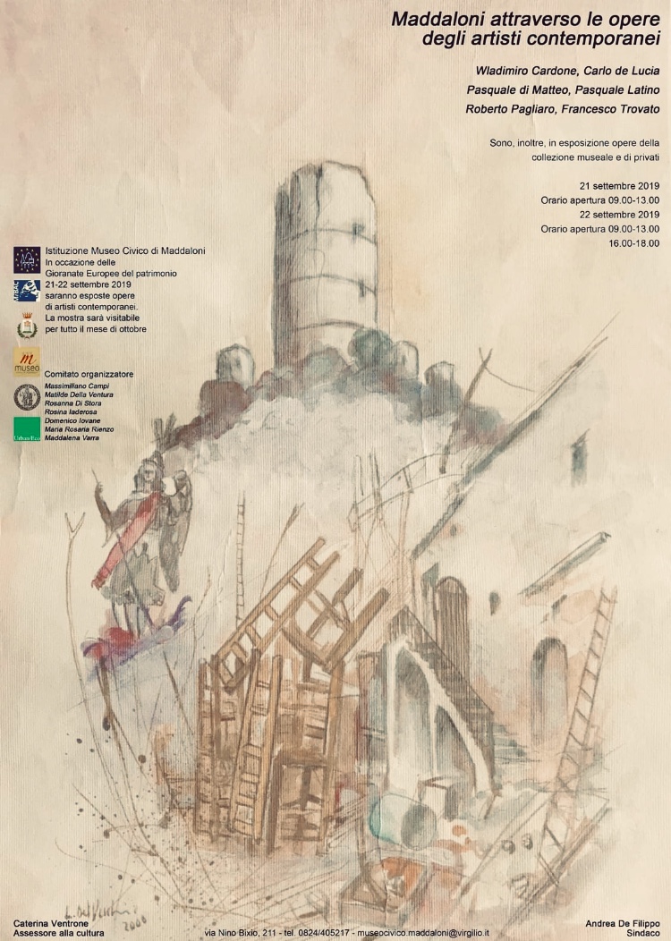 MADDALONI (Caserta) – In occasione della Giornate Europee del Patrimonio, l’Istituzione Museo Civico di Maddaloni ha allestito una mostra che coniuga la realtà semplice e ricca di storia degli scorci cittadini con la fervente immaginazione e forza comunicativa dei suoi artisti. Questa è l’essenza unica e stimolante della mostra “Maddaloni attraverso le opere degli artisti contemporanei” che ha unito la staticità del paesaggio architettonico cittadino all’agitata forza espressiva dei suoi artisti. La rassegna sarà visibile sabato 21 dalle ore 9:00 alle ore 13:00 e domenica 22 dalle ore 9:00 alle ore 13:00 e dalle 16:00 alle 18:00. La mostra però rimarrà aperta al pubblico per tutto il mese di ottobre e seguirà l’orario di apertura del museo. Hanno prestato le loro opere per la buona riuscita della mostra i maestri WladimiroCardone, Carlo de Lucia, Pasquale di Matteo, Pasquale Latino, Roberto Pagliaro e Francesco Trovato. La mostra, che è stata promossa dal Sindaco Andrea De Filippo e dall’Assessore alla Cultura Caterina Ventrone, è stata organizzata da un comitato organizzatore formato dal prof. Massimiliano Campi, dalla dott.ssa Maria Rosaria Rienzo, dalla dott.ssa Maddalena Varra, dagli architetti Domenico Iovane e Rosina Iaderosa, dalla dipendente Matilde della Ventura e dalla volontaria Rosanna Di Stora.