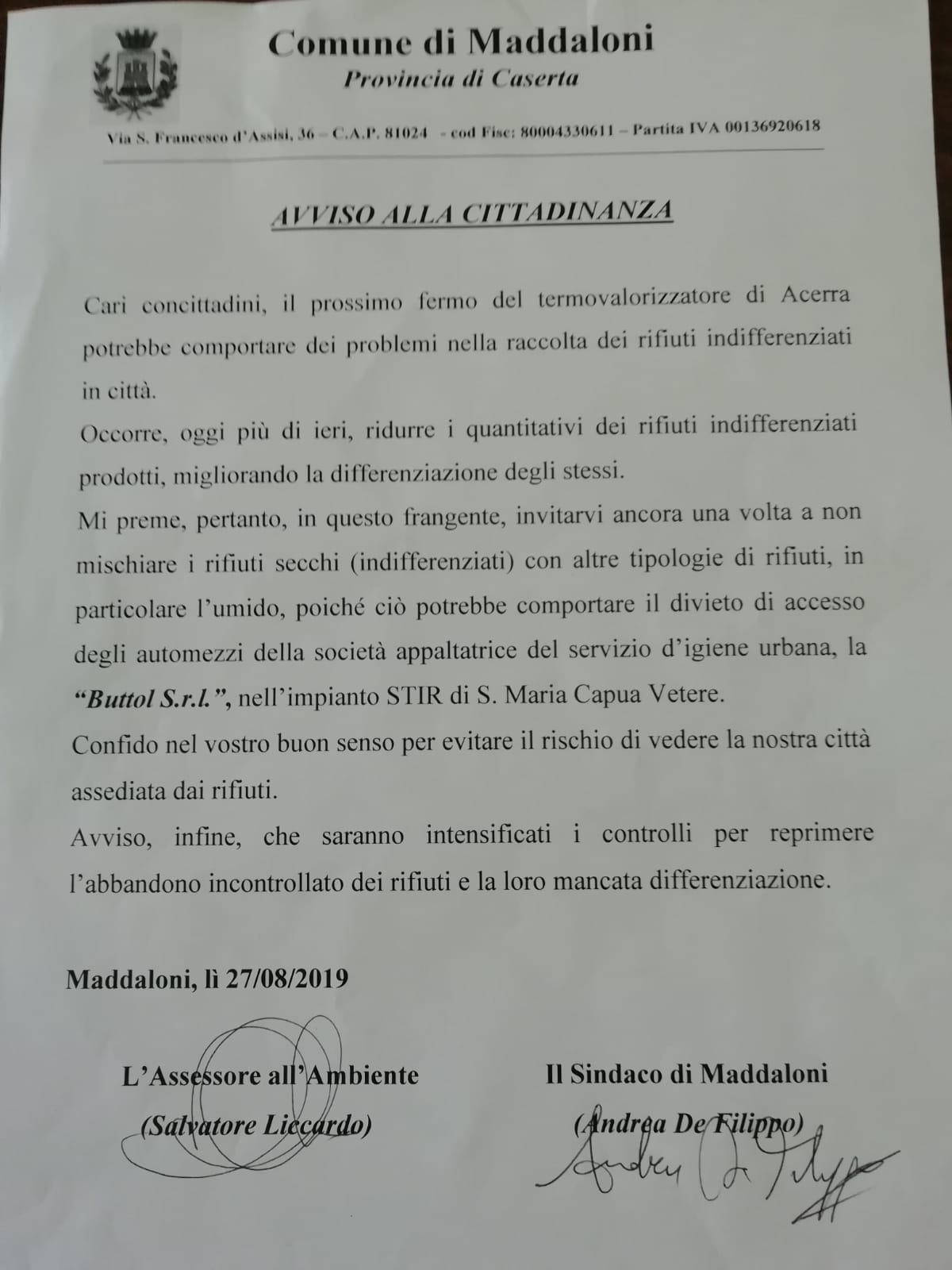 Il Sindaco di Maddaloni Andrea De Filippo e l’assessore all’ambiente Salvatore Liccardo hanno emanato un avviso alla cittadinanza sollecitandoli a differenziare in modo corretto i rifiuti ed a ridurre quanto più possibile la frazione secca indifferenziata. Questo soprattutto perché a breve chiuderà il termovalorizzatore di Acerra per manutenzione: pertanto sarà più difficoltoso lo smaltimento della stessa. Saranno intensificati i controlli per verificare sia il rispetto del calendario della raccolta sia la corretta differenziazione.