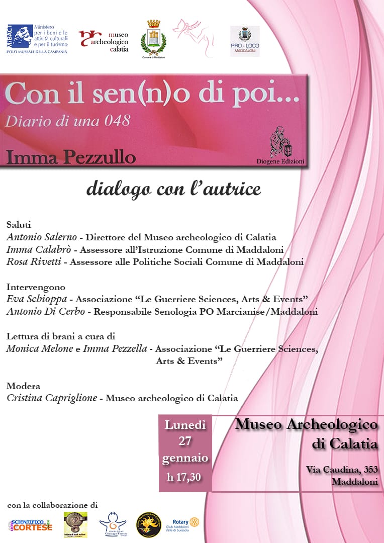 Lunedì 27 gennaio 2020 alle 17.30 il Polo Museale della Campania e il Museo archeologico di Calatia, con il Comune di Maddaloni, l’Associazione Le Guerriere Sciences Arts & Events, la Fondazione Ferraro e la Pro Loco di Maddaloni, ospitano l’autrice del libro “Con il sen(n)o di poi. Diario di una 048”, Imma Pezzullo (Diogene Edizioni).