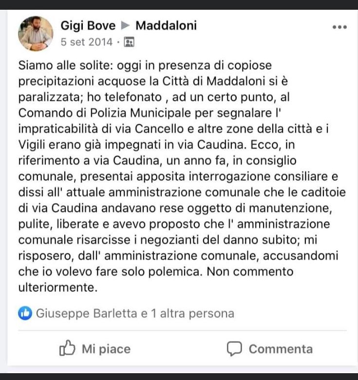 “Per la prima volta sono in sintonia con il vicesindaco Gigi Bove, sull’ allagamento di via Caudina e via Cucciarella, e vi spiego perché: come potete leggere da questo post di Bove, nel 2014 fece egli stesso fece, come consigliere di opposizione, una petizione popolare per l’allagamento di via Caudina. All’epoca l’ amministrazione era de Lucia e Gigi Bove, pur appoggiando ed essendo nello stesso partito di quel sindaco, terminata la campagna elettorale e ,vinte le elezioni, spassò prontamente all’ opposizione. Il motivo di questo salto della quaglia tutt’oggi mi è ignoto, e credo non solo a me. Ricordo altresì che l’amministrazione precedente alla De Lucia era quella di Antonio Cerreto, sempre della stessa area politica, e nella quale Bove era assessore.