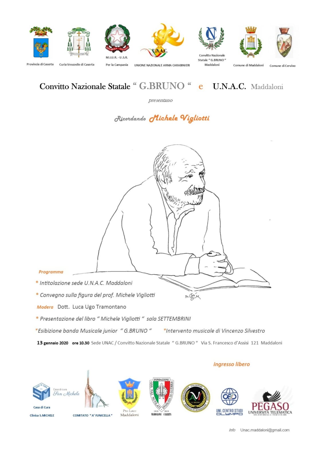 In occasione della ricorrenza del primo anniversario della morte del prof. Michele Vigliotti, il 13 gennaio 2020, alle ore 10.30 circa sarà intitolata la sede della delegazione U.N.A.C. di Maddaloni in via San Francesco d’Assisi al civico 121 alla presenza delle autorità degli enti patrocinanti ad iniziare dal presidente Nazionale dell’U.N.A.C., dott. Antonio Savino, del Vescovo della Diocesi di Caserta, mons. Giovanni D’Alise e da rappresentanti delle altre istituzioni in particolare dei sindaci patrocinanti.