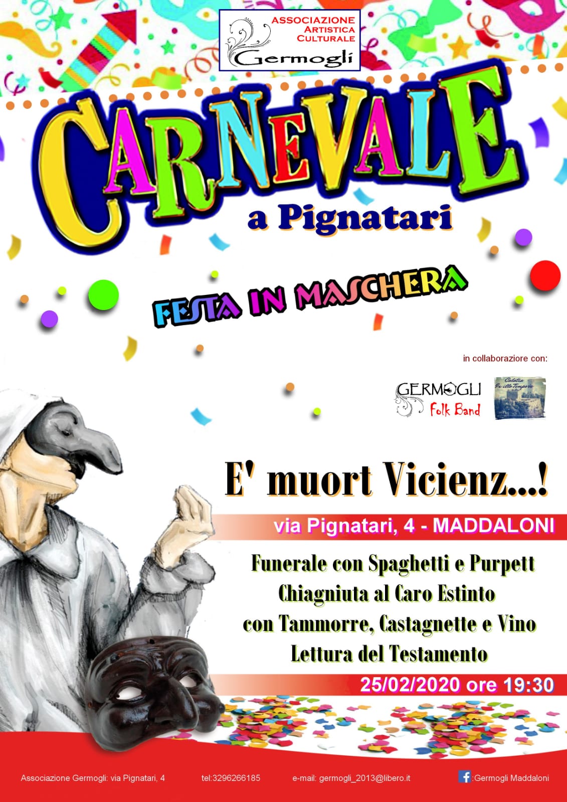Germogli ha come suo scopo primario il recupero, la valorizzazione e la disseminazione della cultura popolare in tutti i suoi aspetti. Per cui non poteva che inscenare per il giorno 25 la morte di Vicienzo dopo la lauta cena a base di polpette e il conseguente funerale con lamenti e pianti e la lettura finale del testamento. Collaborerà all’evento il gruppo Calatia in illo tempore che insieme alla Folk band di Germogli allieterà i convenuti con canti e balli della tradizione. La manifestazione è autofinanziata.
