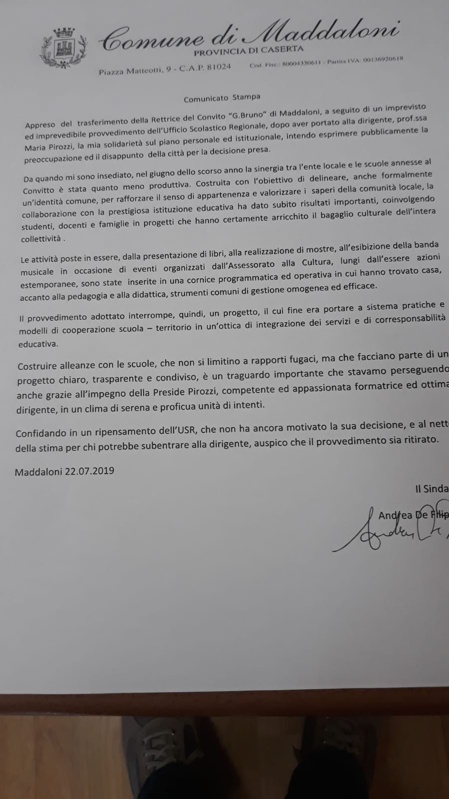 Il sindaco di Maddaloni, Andrea De Filippo, a seguito del trasferimento della rettrice del Convitto Nazionale “G.Bruno” La dott.ssa Maria Pirozzi, esprime pubblicamente con un comunicato la sua solidarietà e vicinanza alla preside. Nel Comunicato emerge un chiaro disappunto per la decisione presa dagli organi competenti e si evidenziano le attività culturali e formative svolte nella storica scuola maddalonese durante il periodo di dirigenza della preside Pirozzi.
