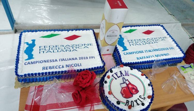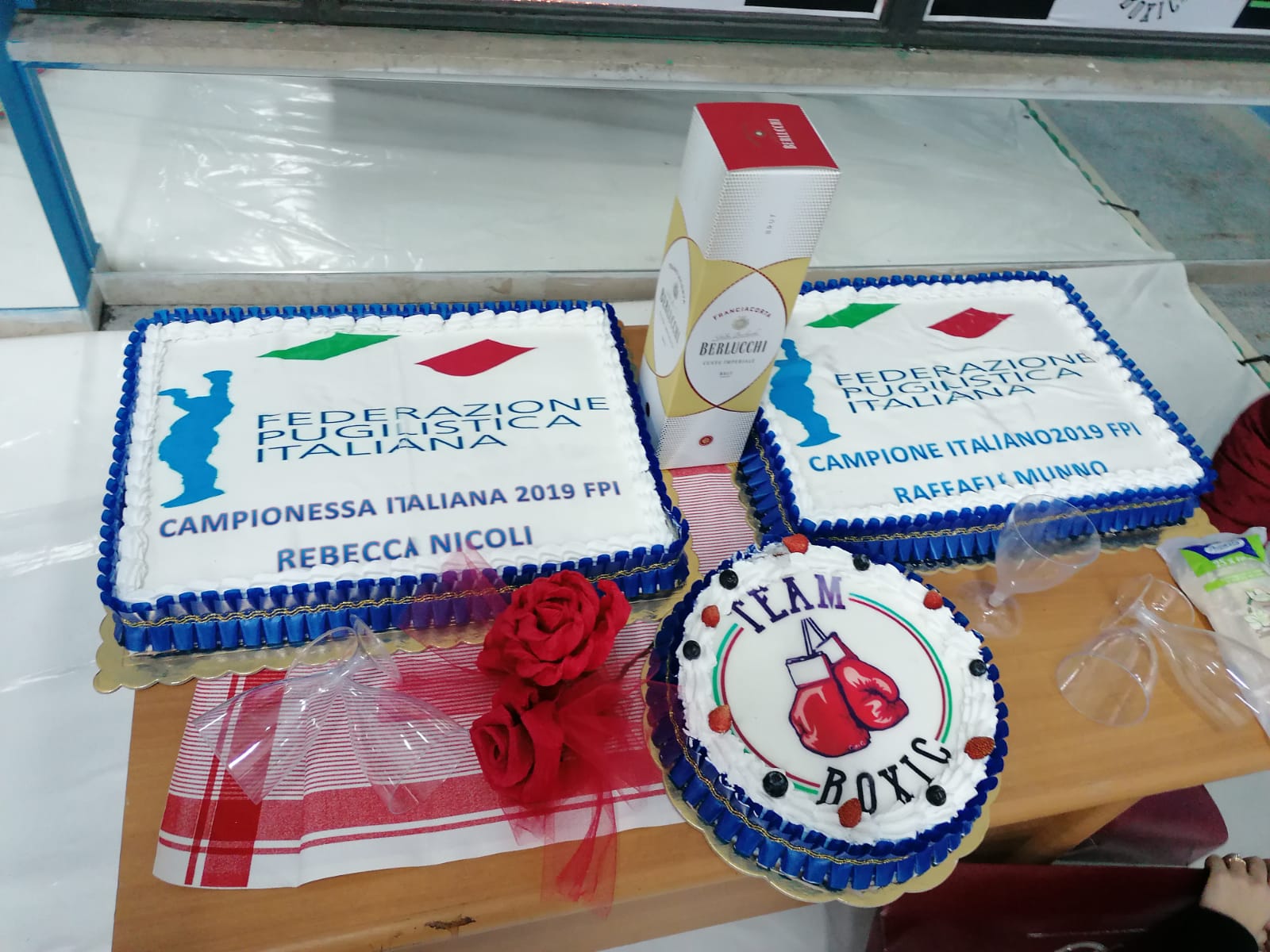 Grande festa ieri nella palestra del Team Boxic. I campioni italiani del 2019 FPI, Federazione Pugilistica Italiana , il carabiniere Raffaele Munno e Rebecca Nicoli hanno voluto festeggiare il prestigioso titolo con tutto lo staff del team Boxic. Presenti all’ evento i padroni di casa Clemente Di Crescenzo, Luca Piscitelli e Domenico Pezzullo della disciplina MMA ed allenatori  della Legio’s team asd team boxic .  Entrambi i campioni  sono amici del team e hanno sposato il loro progetto sul no alla violenza sulle donne e no al bullismo. Le torte sono state preparate dalla pasticceria Del Monaco.