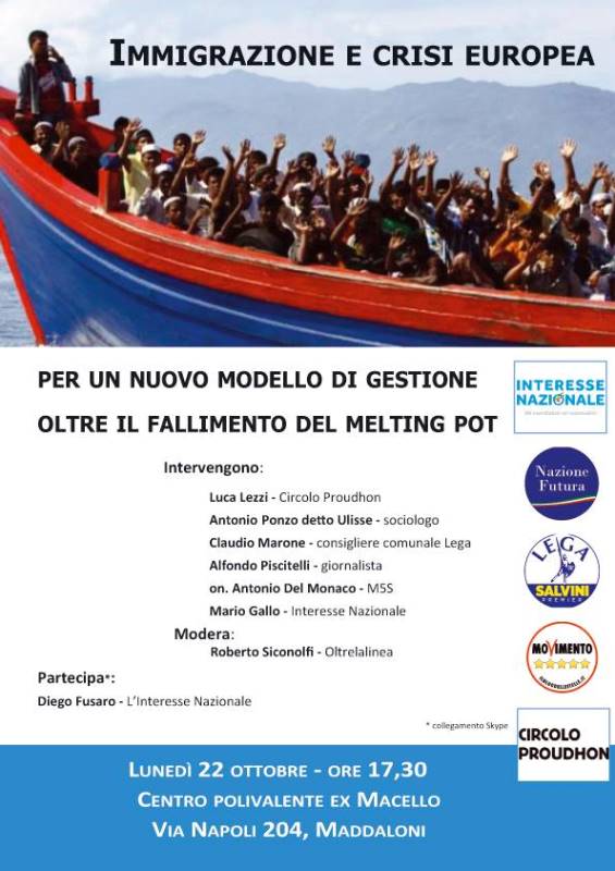 MADDALONI – Nel pomeriggio di lunedì, 22 ottobre 2018, con inizio alle ore 17:30, presso il Centro Polivalente (ex Macello), in via Napoli 204, si terrà il convegno su una delle tematiche più attuali e discusse del nostro panorama politico e sociale: “Immigrazione e crisi europea – Per un nuovo modello di gestione, oltre il fallimento del Melting Pot”. Il convegno ha lo scopo di analizzare il fenomeno, molto dibattuto, delle politiche migratorie, cercando non solo di carpirne le vere cause, ma tentando di arrivare al giusto metodo per arginarlo. All’evento, simbolo di un ritorno ad un dibattito politico-sociale di alcune problematiche di caratura nazionale, prenderanno parte: Luca Lezzi del “Circolo Proudhon”, Antonio Ponzo detto “Ulisse” di “Alternativa Campania”, Claudio Marone, consigliere comunale “Lega – Salvini Premier”, Alfonso Piscitelli, giornalista, on. Antonio Del Monaco, Deputato del “Movimento 5 Stelle”, e Mario Gallo dell’ “Interesse Nazionale”. Inoltre, in collegamento Skype, interverrà il filosofo Diego Fusaro. A moderare gli interventi sarà invece Roberto Siconolfi collaboratore della rivista online “Oltre la linea”. “Il convegno di domani – ha dichiarato Siconolfi, organizzatore dell’evento – avrà due funzioni. La prima di informare il pubblico e la cittadinanza sui vari aspetti della questione migratoria, uno dei temi più scottanti a livello nazionale, insieme a quello economico-finanziario. L’argomento sarà affrontato senza pregiudizi di alcun tipo e in base a letture e “visioni del mondo” anche differenti tra loro, ma che siano “sistemiche” ed intellettualmente “stimolanti”. L’altra funzione sarà quella di essere un punto di incontro tra tutte le formazioni politiche, associazioni e gruppi che da un lato affermano principi come la sovranità economica, popolare e nazionale, dall’altro si battono contro le ingerenze UE, la disinformazione del “mainstream mediatico” e l’ideologia “globalista” a tutto tondo. Dopo gli interventi dei relatori il pubblico interverrà con domande, al fine di favorire il dibattito in maniera “esaustiva” per tutti i partecipanti”.